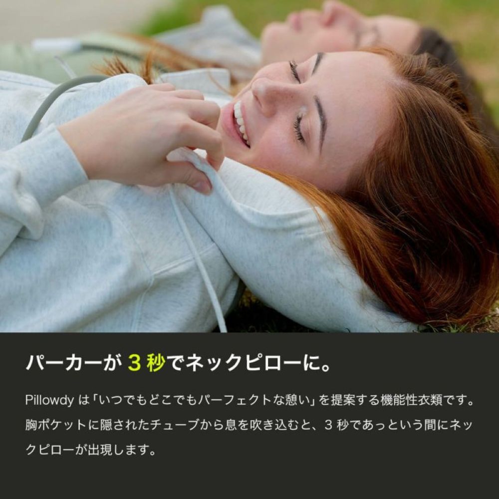 ネックピロー内蔵型パーカーPillowdy(ピロウディ)は、「いつでもどこでもパーフェクトな憩い」をコンセプトに開発された機能性ウェアです。