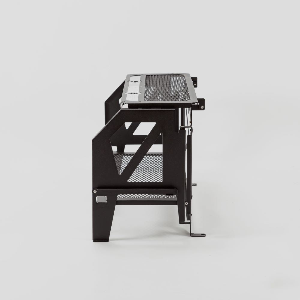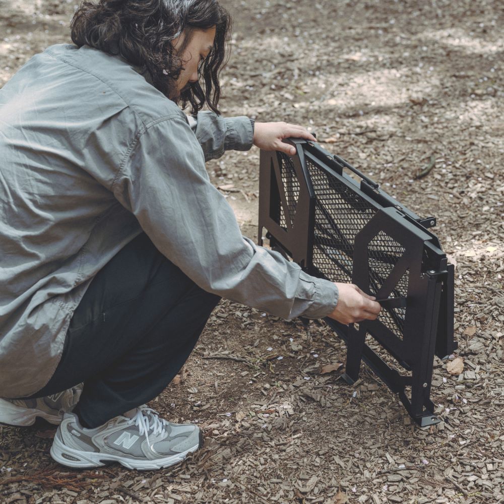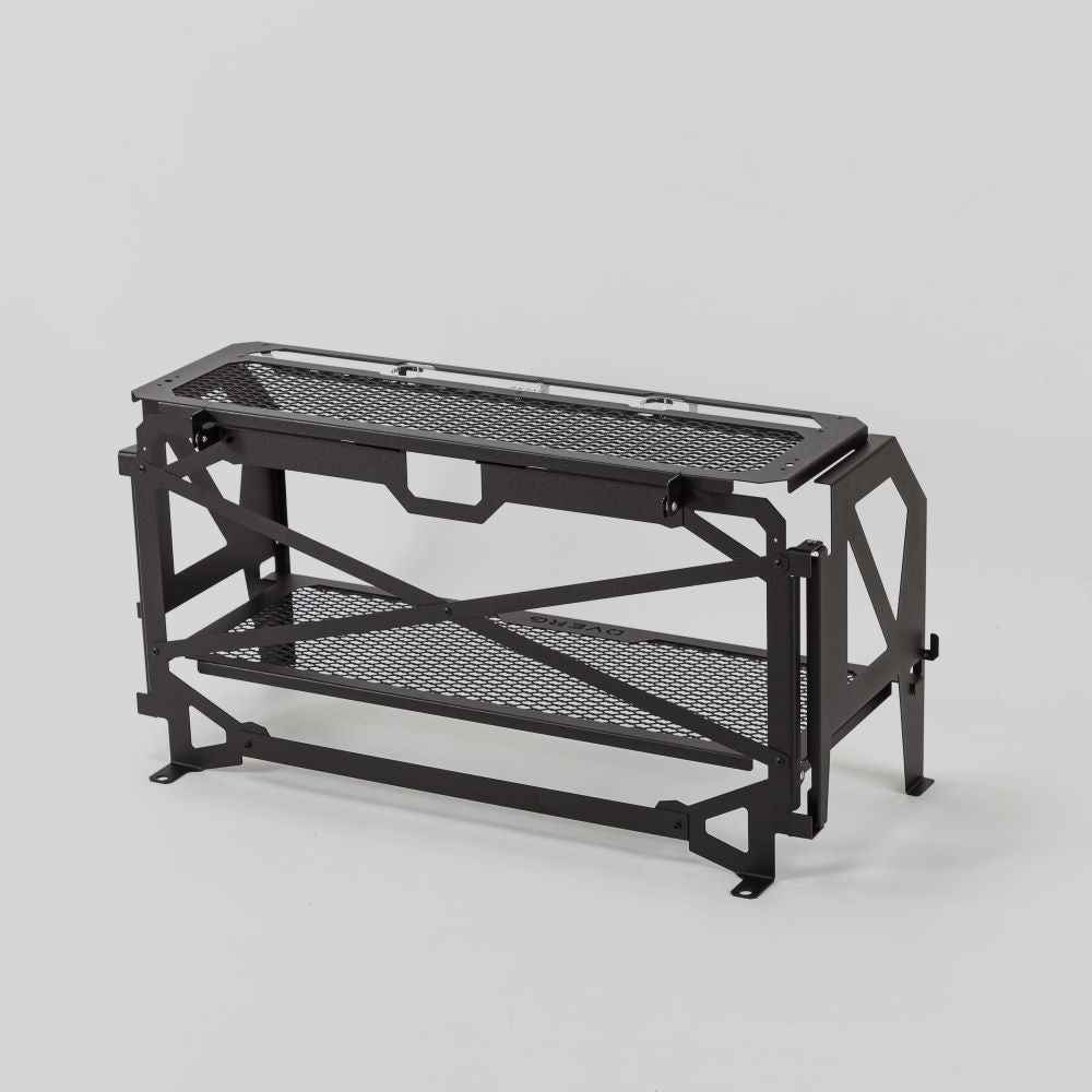 独自のフォールディング機構で収納時は薄くコンパクトに、展開時はワイドな収納ラックに変身。