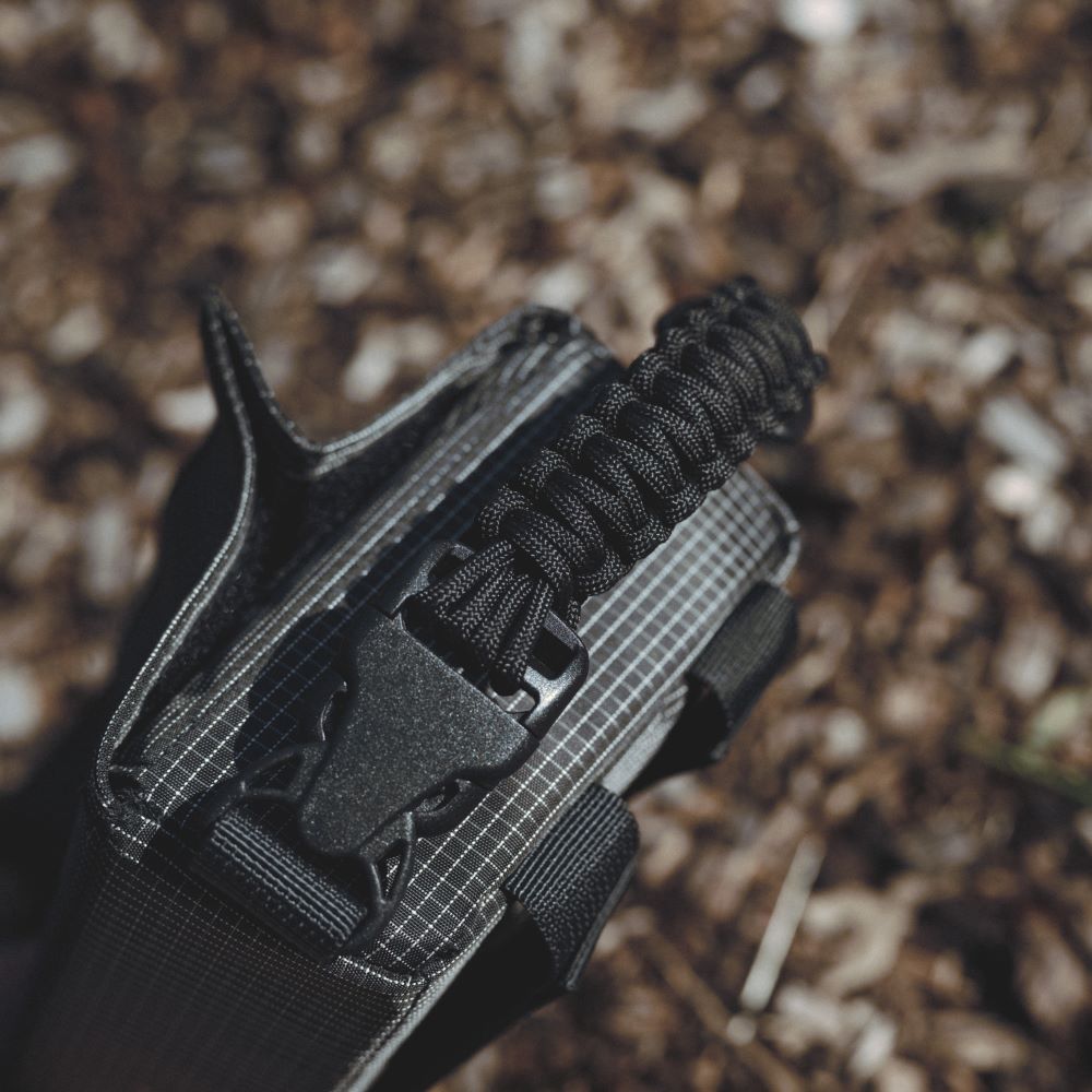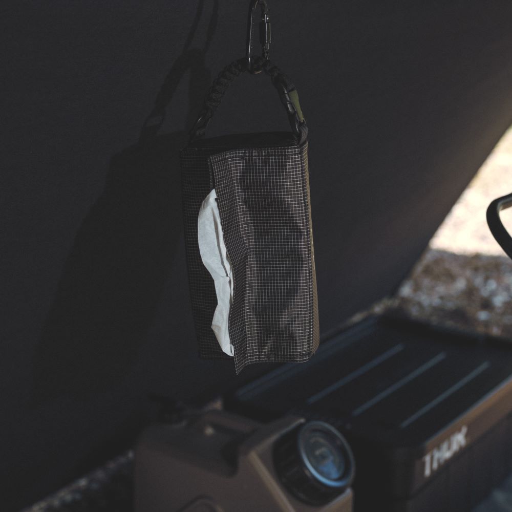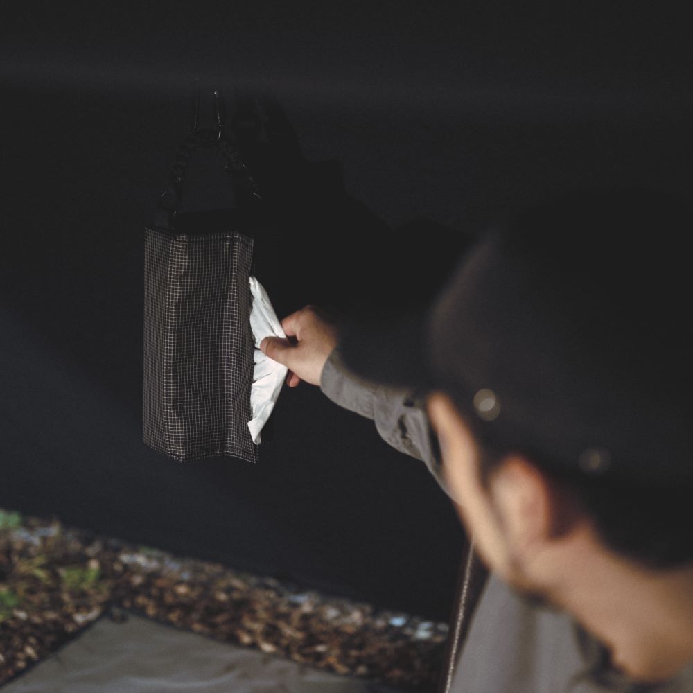 パラコードハンドルでテント内に吊り下げたり、背面のベルトで車内に取り付けたりと、使う場所を選ばない便利なアイテム。