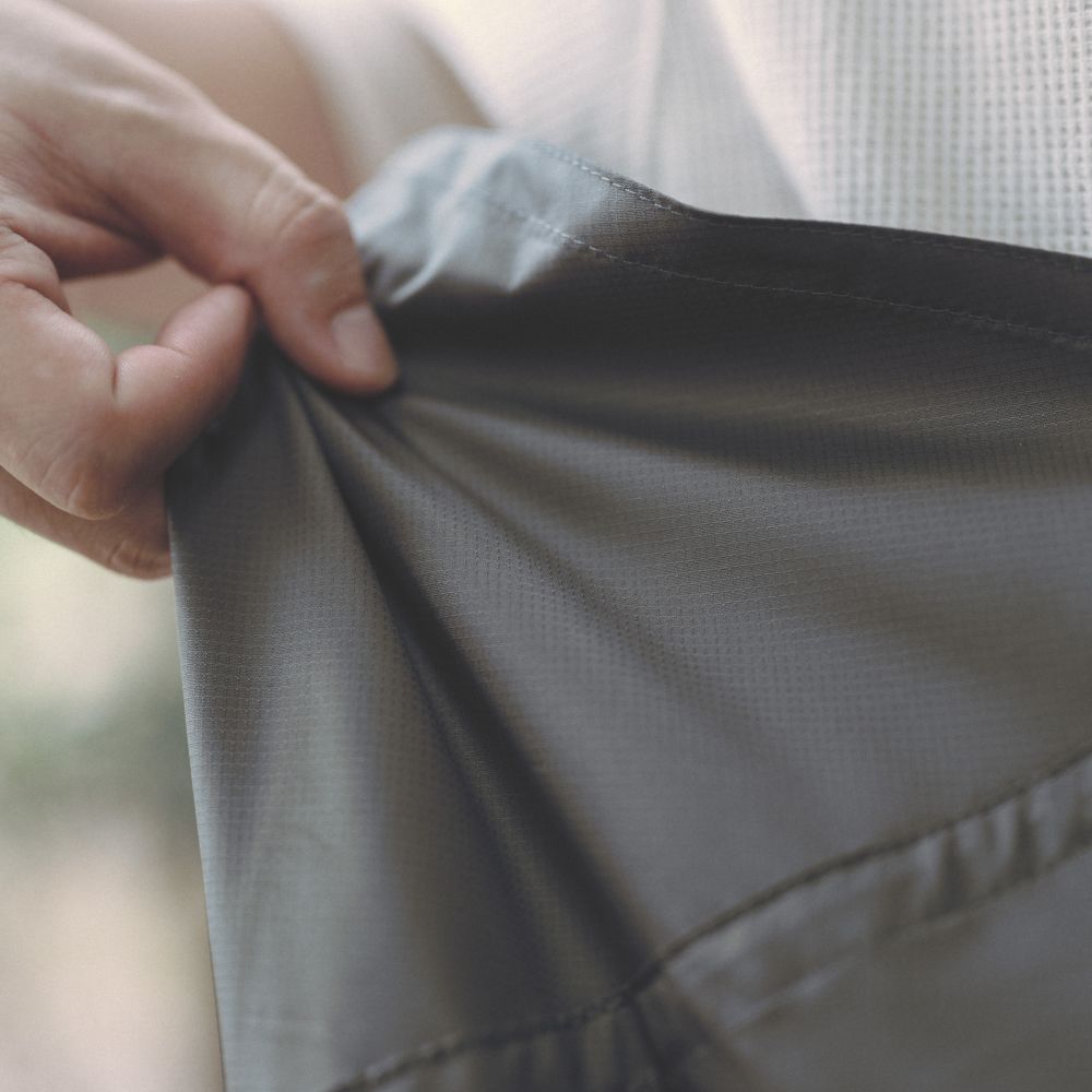 マイクロファイバー高密度織物に撥水技術を融合した、ソフトでしなやかな風合いのノンコーティング防・撥水・透湿素材を使用。コーティング剤不使用ながら高い防水性と持続する撥水性を備え、優れた透湿性も実現しています。