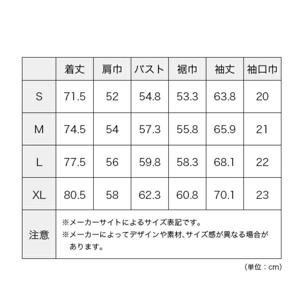 | 着丈 | 肩巾 | バスト | 裾巾 | 袖丈 | 袖口巾 | |