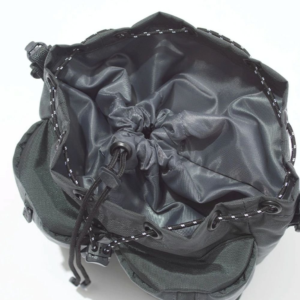 フロントに便利なジップポケットを備えた、機能性とデザイン性を兼ね備えたドローストリングバッグ