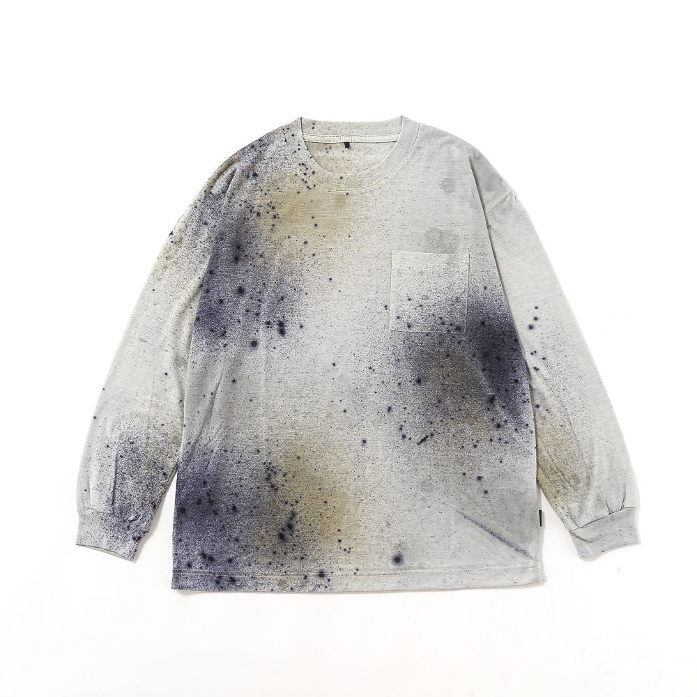 ウールとポリエステル(クールマックス)とのミックス素材で、山でのメリノウールの着心地を残しつつ、ウール100%のアイテムに比べて、乾きやすさ・蒸れにくさ・縮みが少ない・擦れに強い・毛玉が出来にくいなどの特徴を持った AXIOウールを使用し、天然の染料で染め上げたロングスリーブTです。