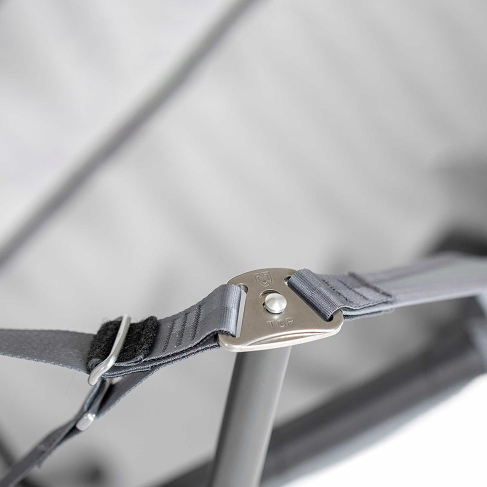 エアクラフトグレードのアルミフレームにベント加工を施すことで座面高を下げ、安定感を高めています。