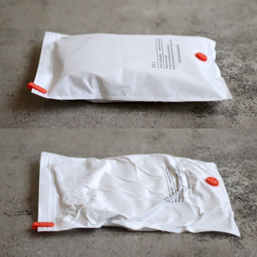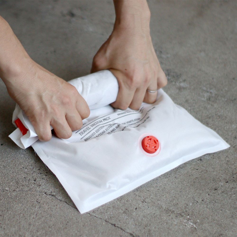 袋の上部をスライダーで閉じ、手で袋を丸めて中の空気をロック式排気弁から排出することで圧縮が完了します。