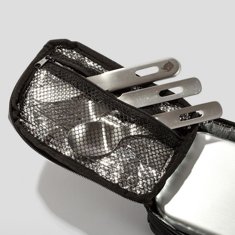 全開式蓋子方便放入和取出,內部有一個帶拉鍊的網袋。餐具和調味品可以存放在一起,這款 Mestin 收納盒注重細節。