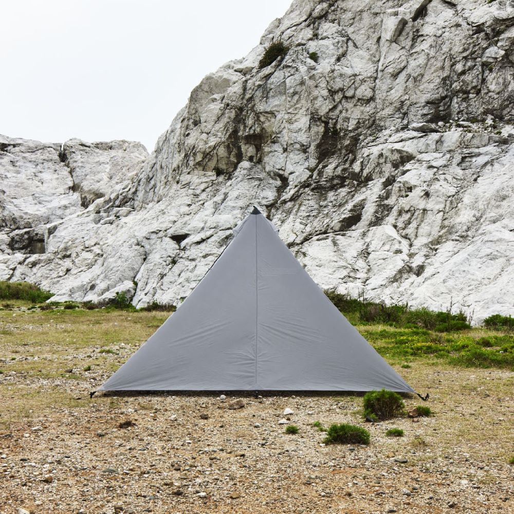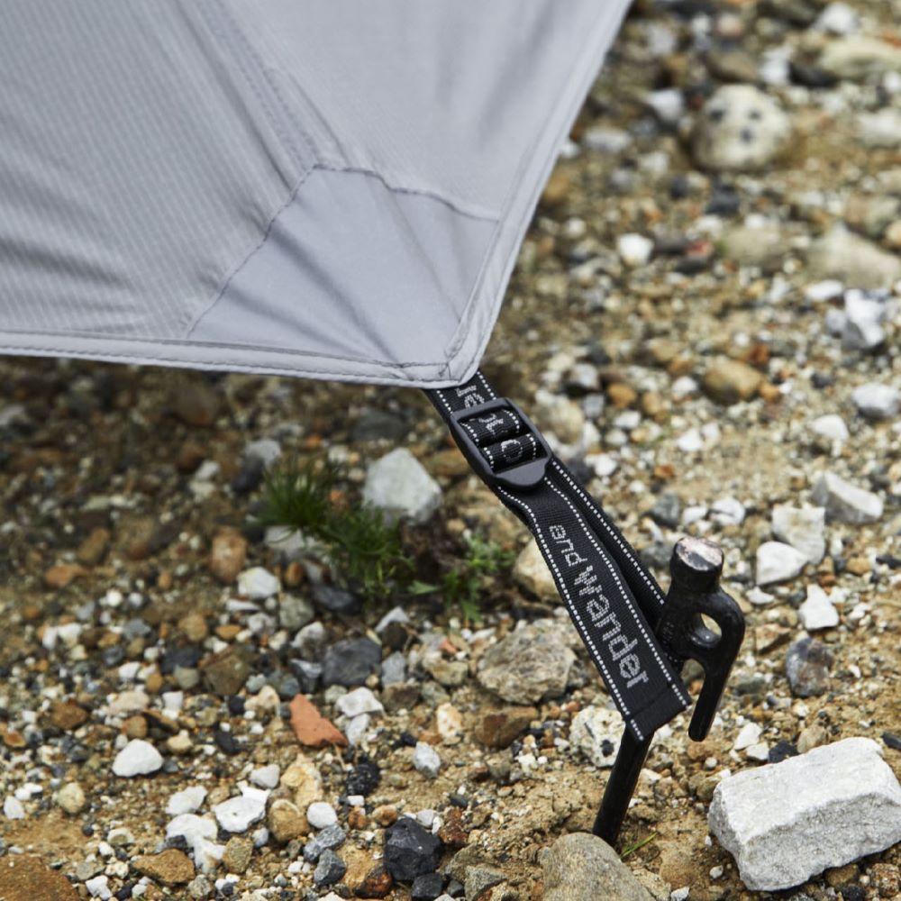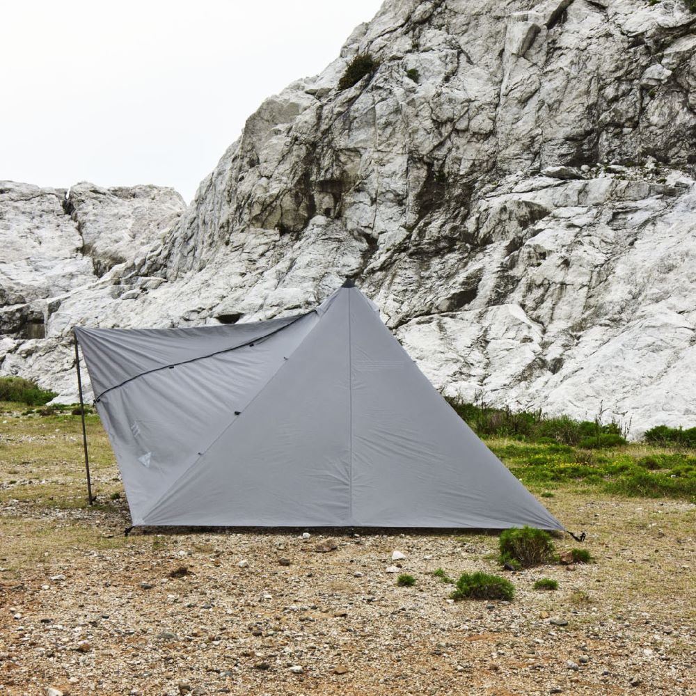 and wanderとmuracoでコラボレーションしたキャンプ用1ポールシェルターテントは、フライシートには耐水圧1500mmの40Dリップストップナイロン、インナーテントのフロア、グラウンドシートには耐水圧3,000mmの68Dリップストップポリエステル、ポールは直径25mmのアルミニウム合金を使用しています。