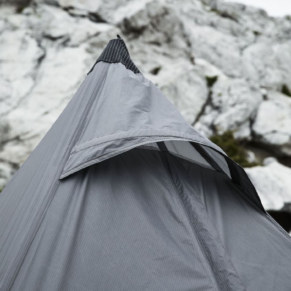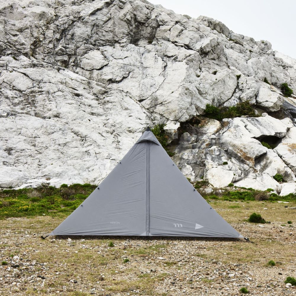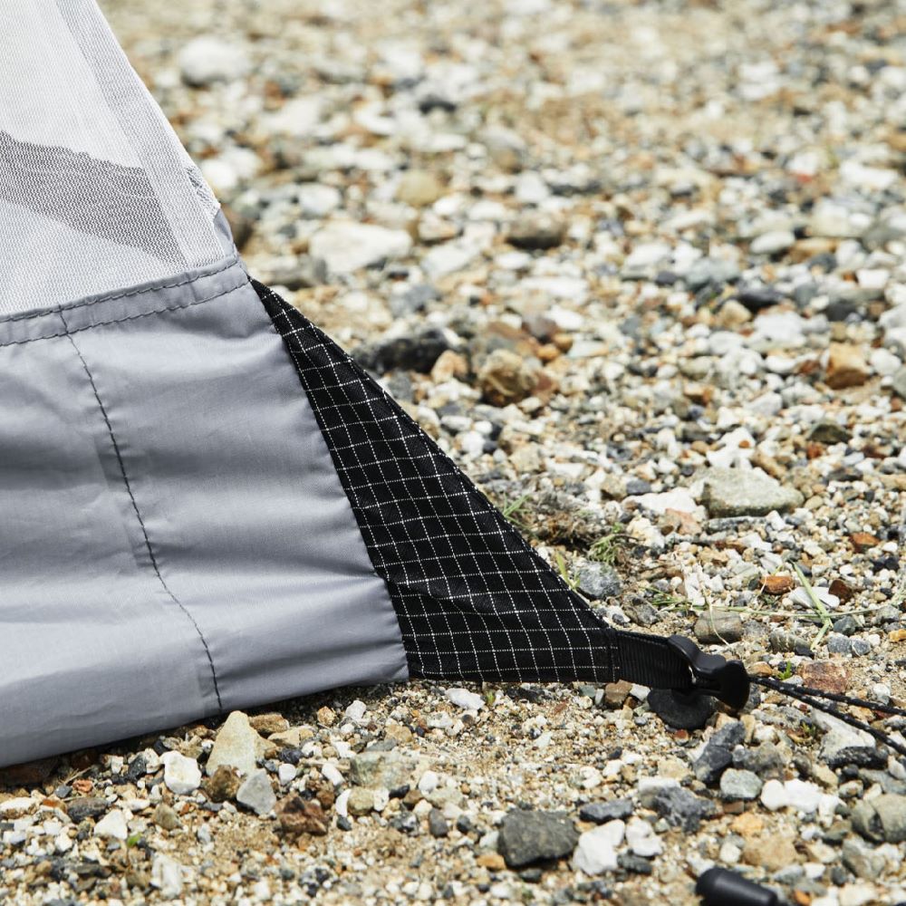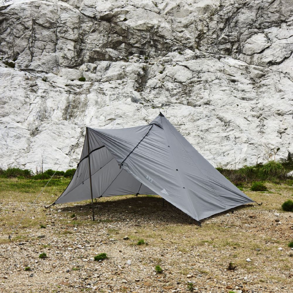 and wanderとmuracoでコラボレーションしたキャンプ用1ポールシェルターテントは、フライシートには耐水圧1500mmの40Dリップストップナイロン、インナーテントのフロア、グラウンドシートには耐水圧3,000mmの68Dリップストップポリエステル、ポールは直径25mmのアルミニウム合金を使用しています。