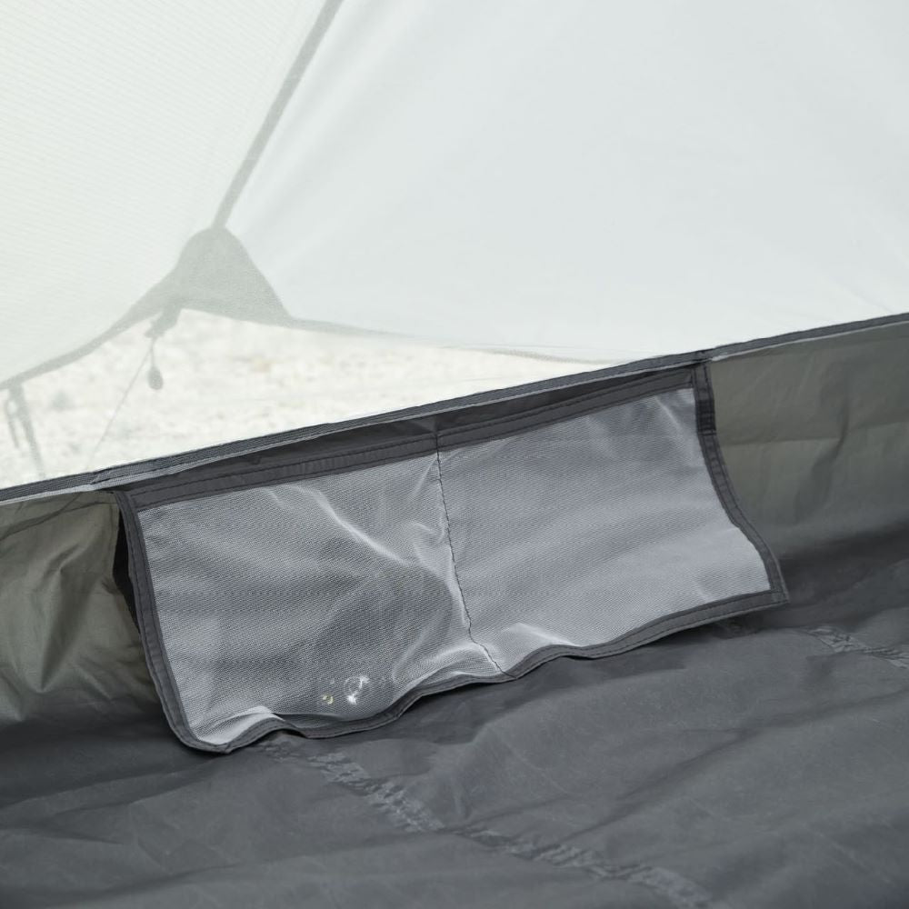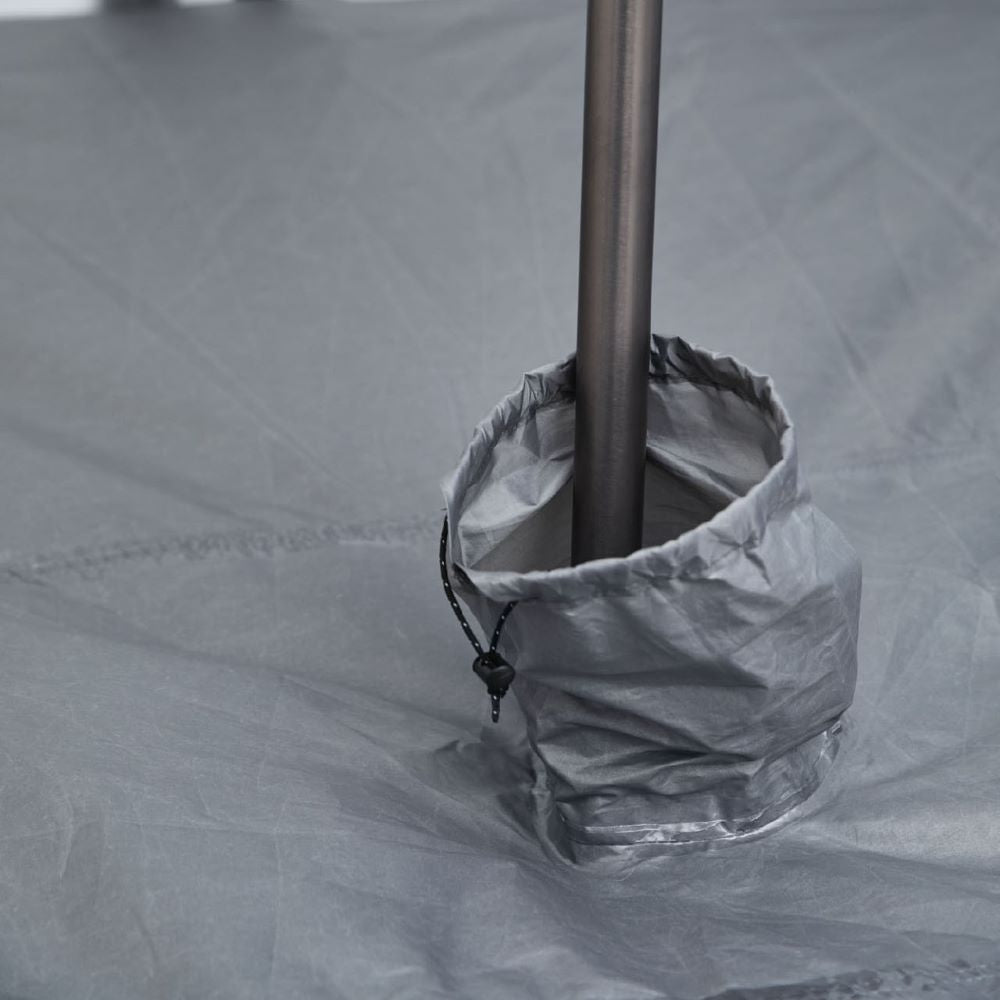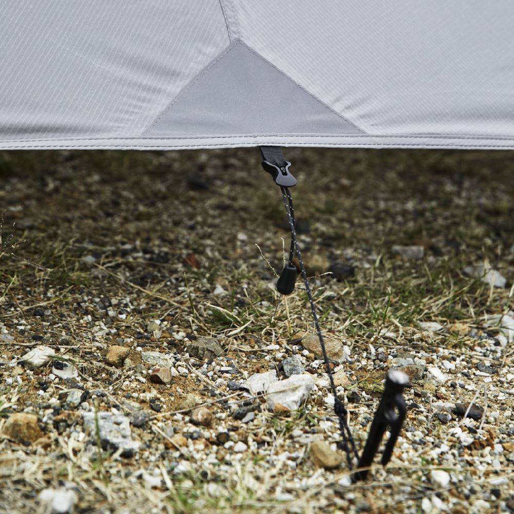 フライシート四隅をペグダウンした後にセンターポールを立てるだけで、非常に短い設営時間と少ない労力で大容量のシェルターを設置することができます。