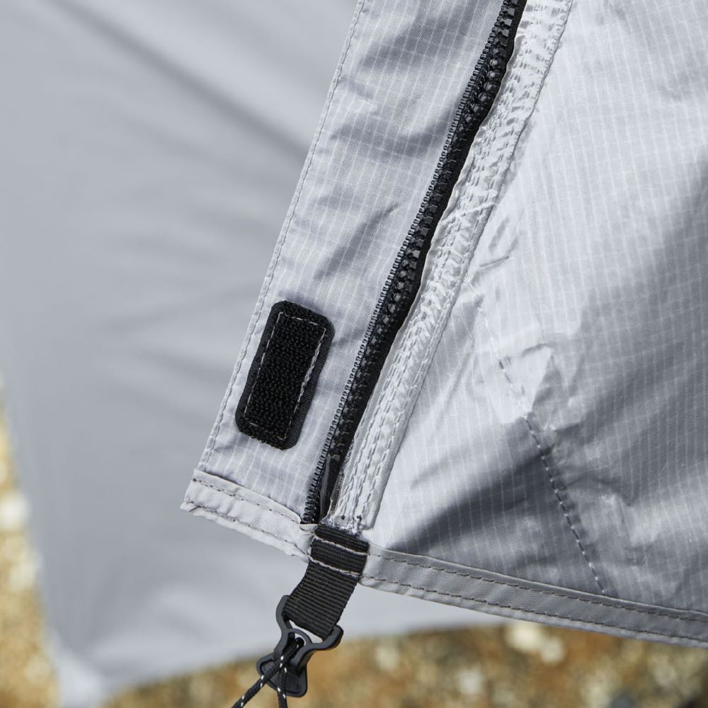 フライシートの出入口に付いているファスナーに、ビークを取り付けてポールで立ち上げることで、軒のような空間を作ることが出来ます。