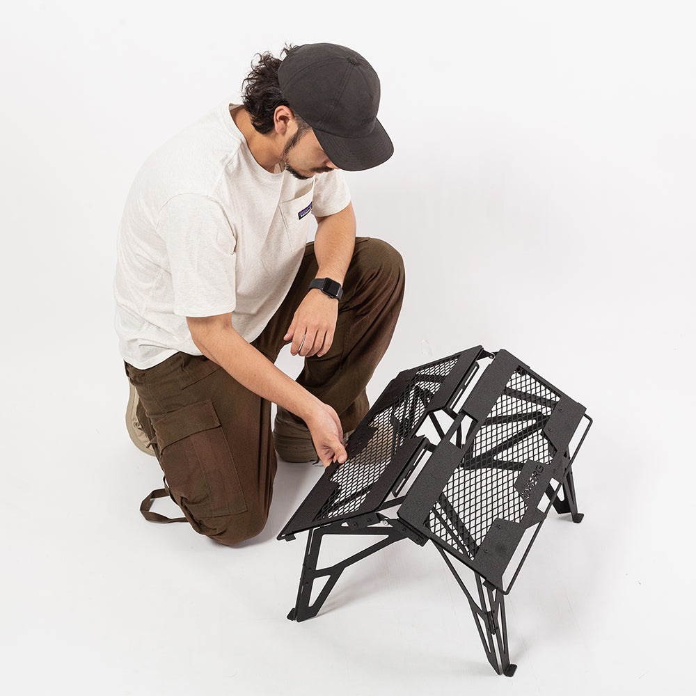 單手咖啡桌是可以用一隻手展開和存儲的桌子。收起時,抓住位於頂板中央的握把部分,筆直向上提起,瞬間折疊起來,方便拿取。