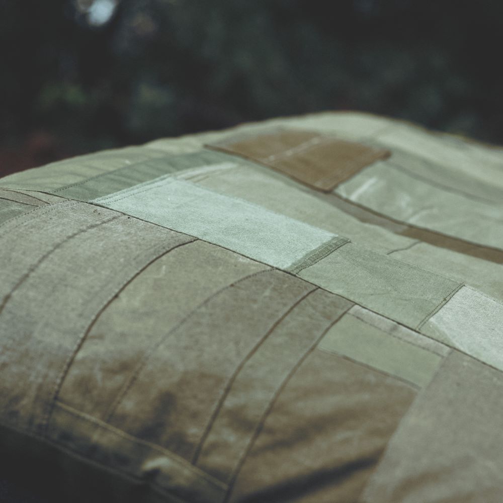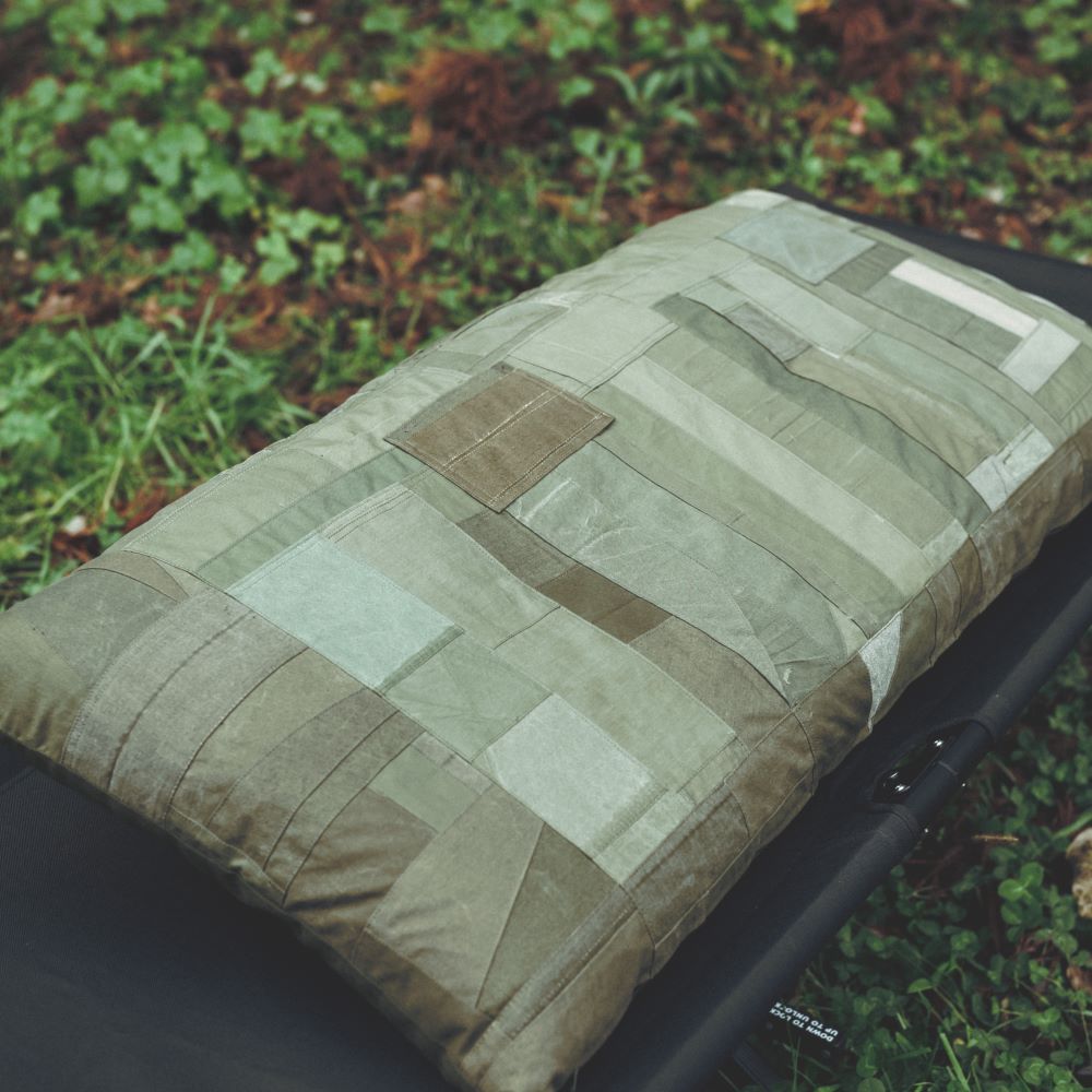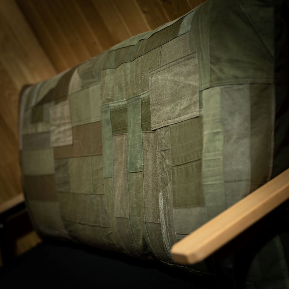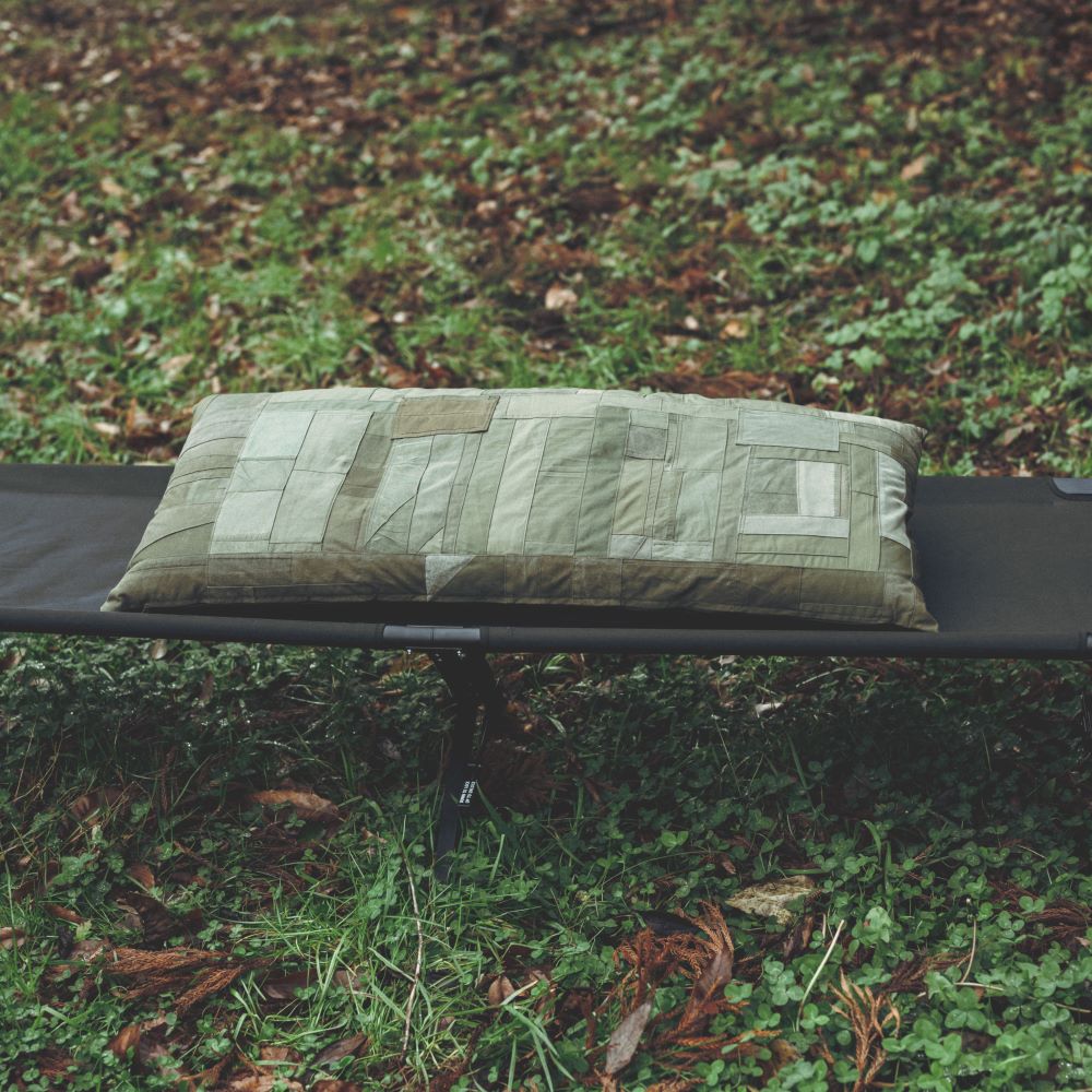 你知道露營燒烤的經典折疊凳嗎?這將是一個完美尺寸的墊子,適合那張長凳。承諾在所有前表面使用複古軍用面料。一側完成了拼湊。除了復古面料外,棉絮都是福井縣製造的。它不僅適合戶外使用,也適合放在客廳的長沙發上。我希望你睡覺的時候把它當作抱枕,我希望你夢見過去的美好時光。