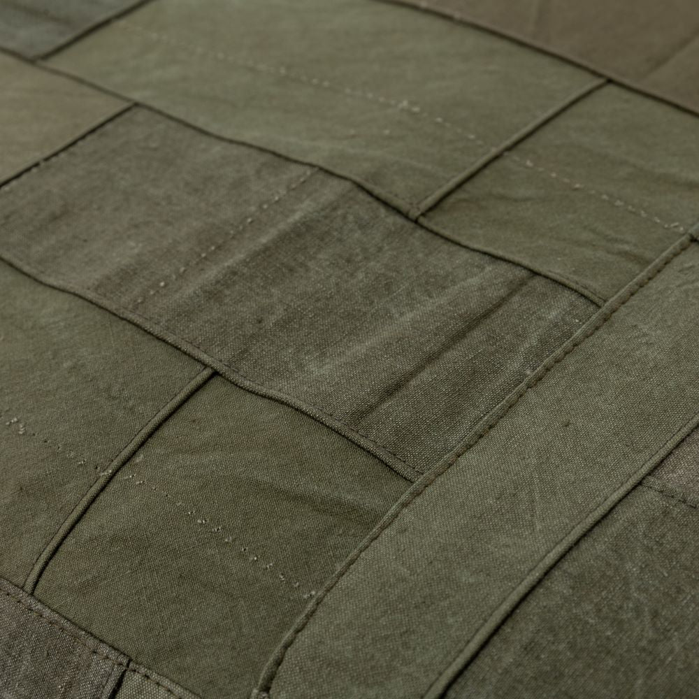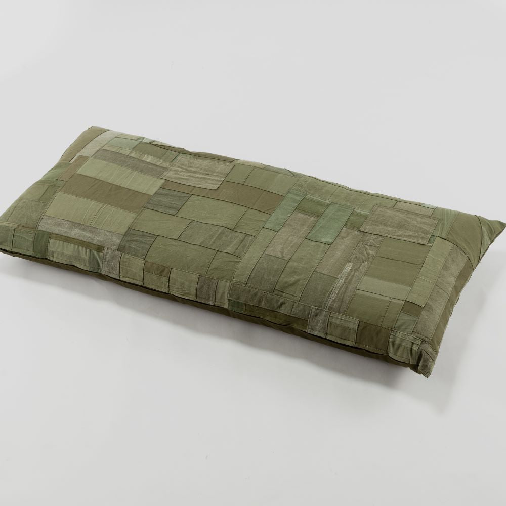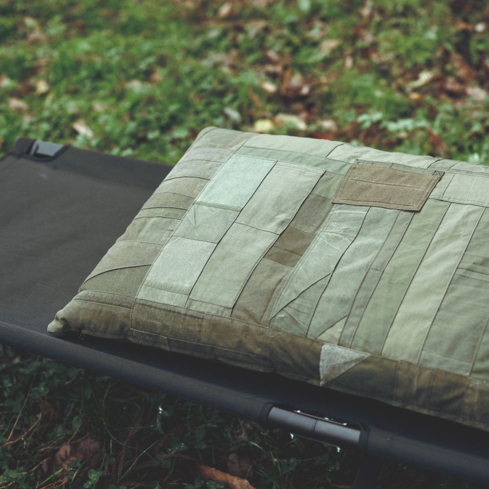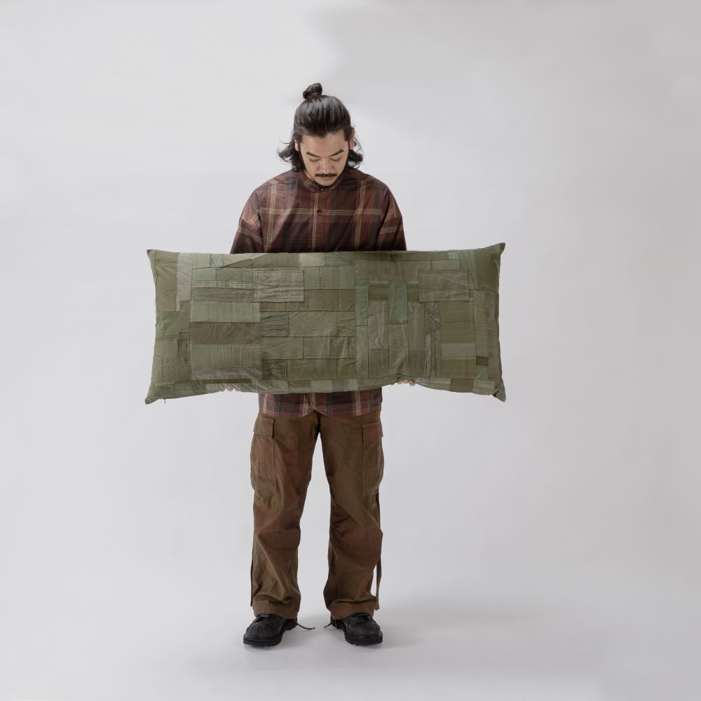 你知道露營燒烤的經典折疊凳嗎?這將是一個完美尺寸的墊子,適合那張長凳。承諾在所有前表面使用複古軍用面料。一側完成了拼湊。除了復古面料外,棉絮都是福井縣製造的。它不僅適合戶外使用,也適合放在客廳的長沙發上。我希望你睡覺的時候把它當作抱枕,我希望你夢見過去的美好時光。