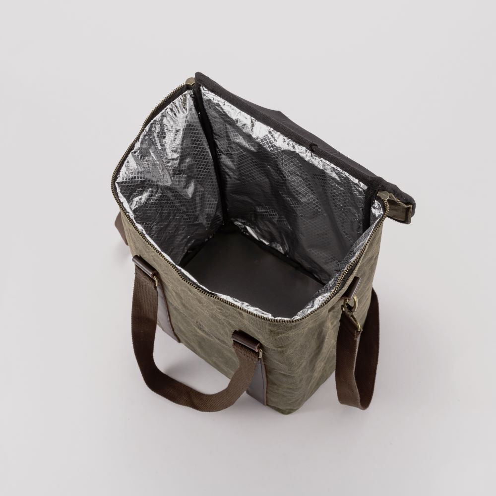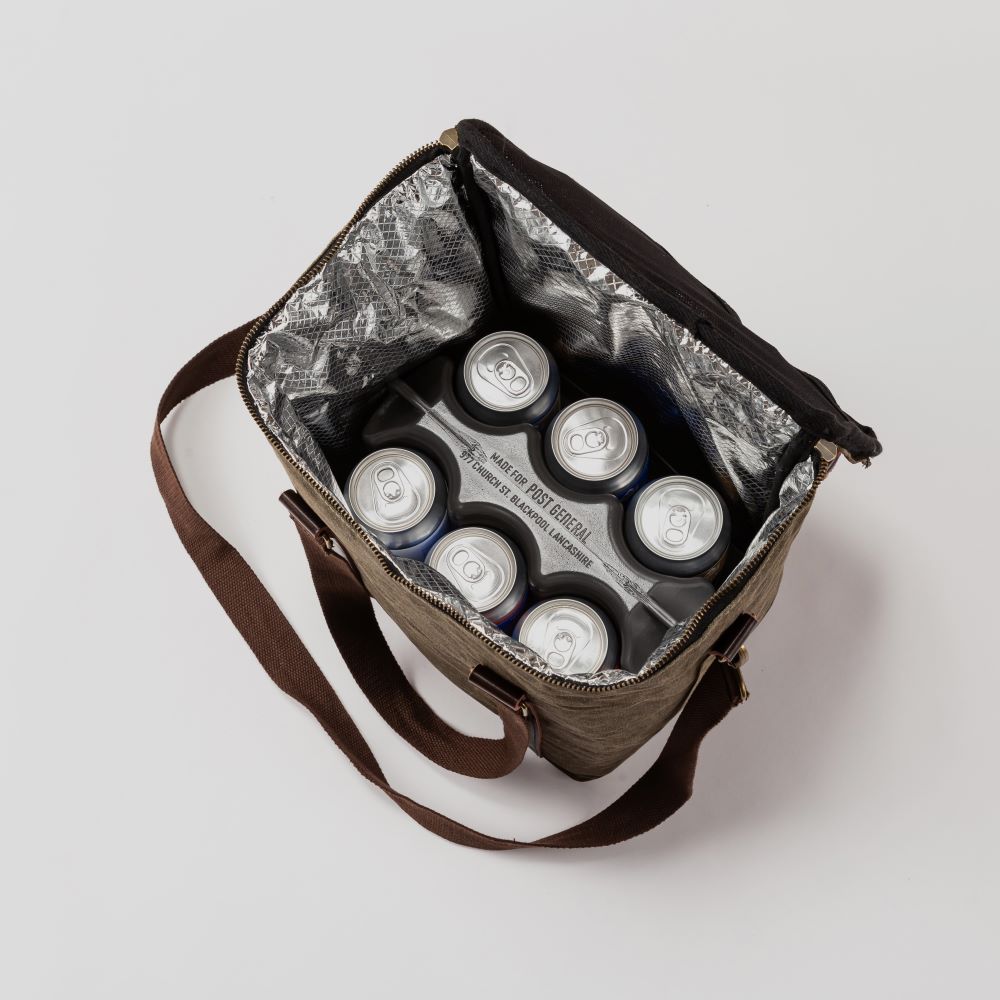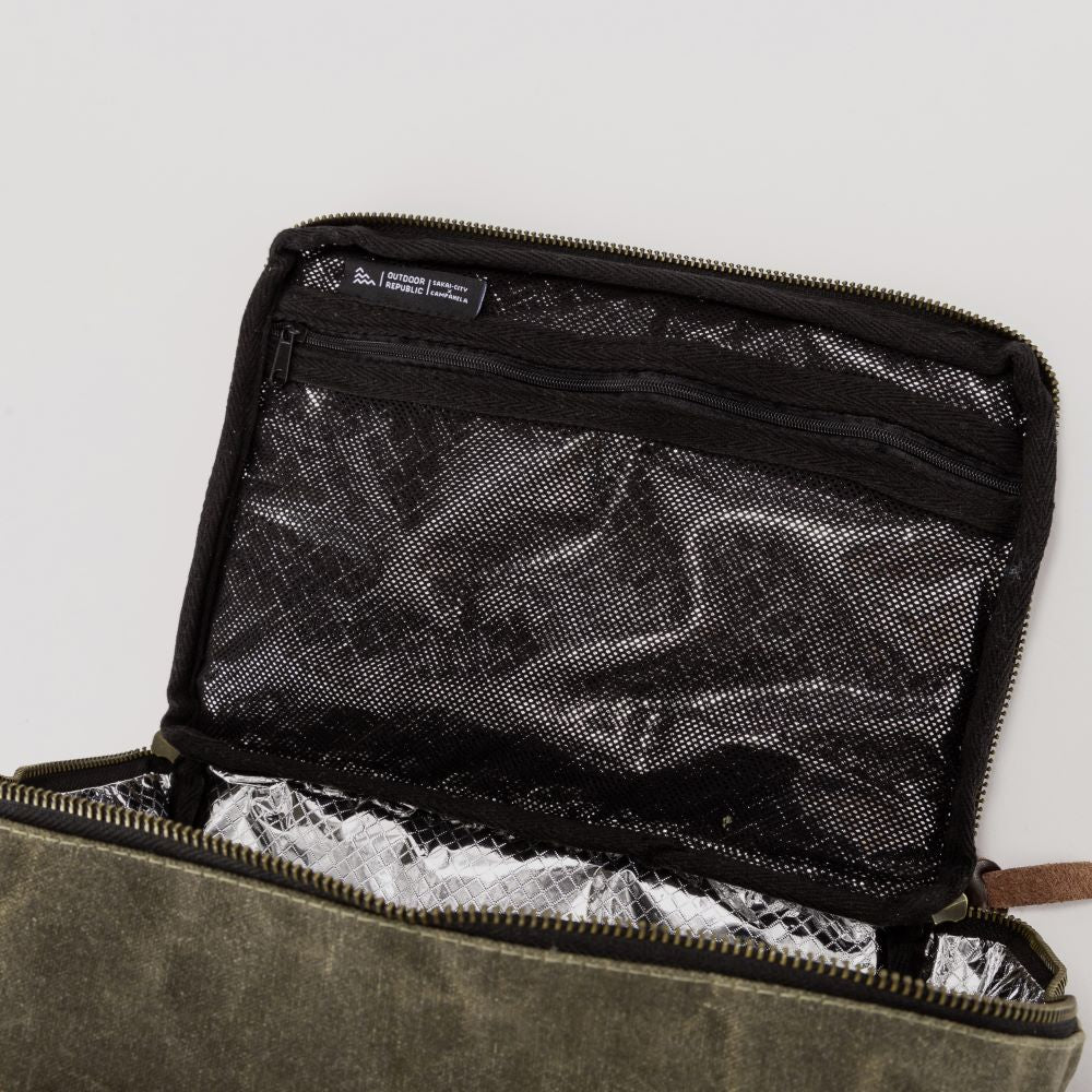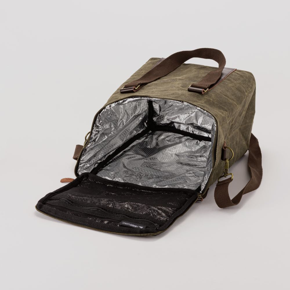 底敷きが入っており、持ちやすく、荷崩れしにくくなっています。 また、本体内側上部にはメッシュポケットがついており、保冷剤を入れての冷却効果の持続や、 オープナーなどを入れる小物入れとしても使用可能。