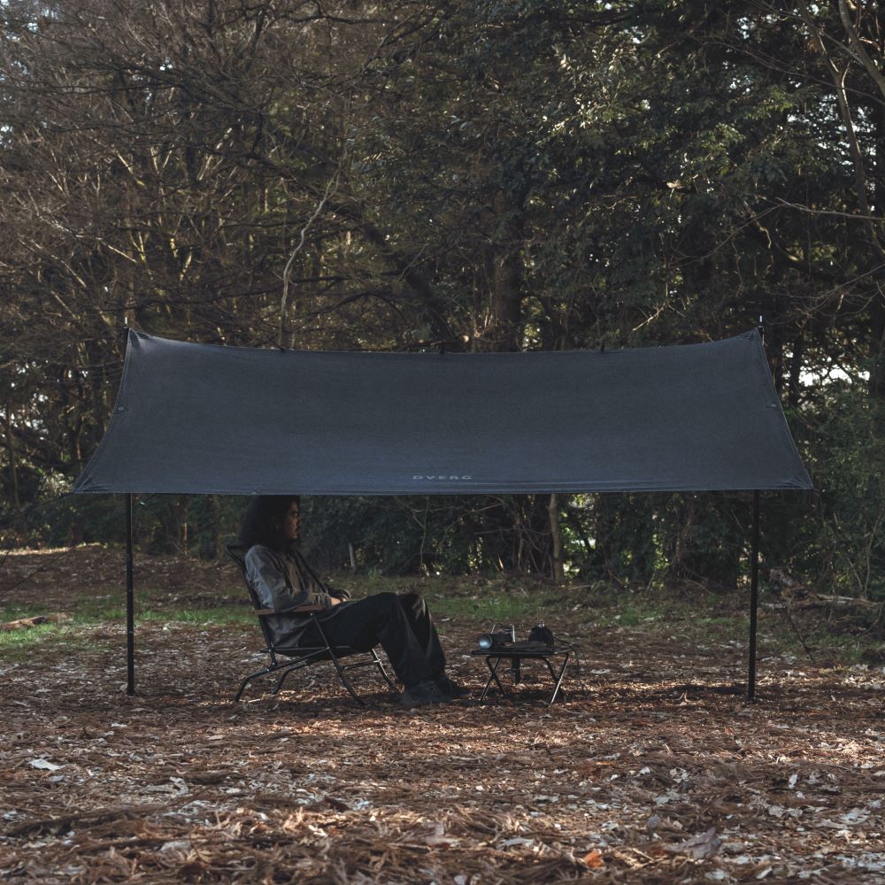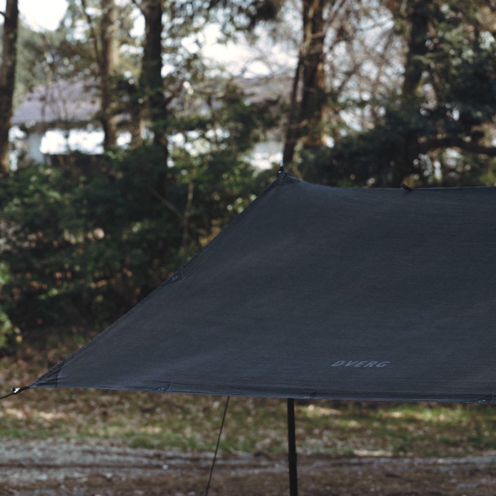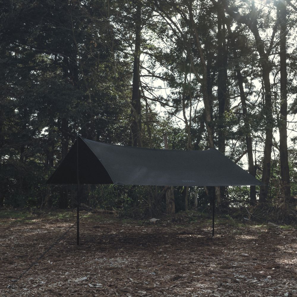 形状は汎用性の高いスクウェアタープ。テープロール10ヵ所、グロメット9ヵ所の計19ヵ所を駆使することで色々な張り方を可能にしている。ファミリーからソロまでシーンに合わせて色んな張り方を試して欲しい。