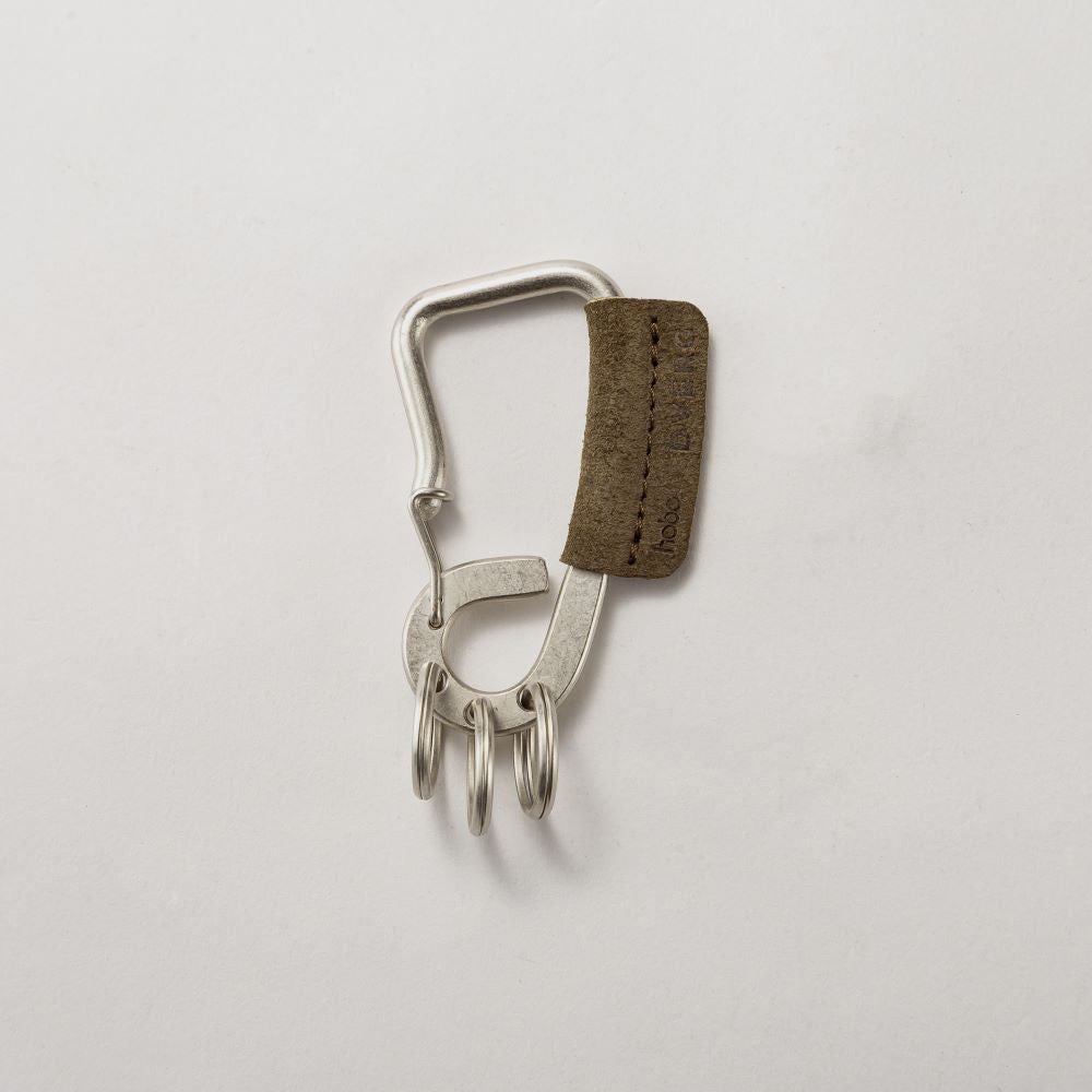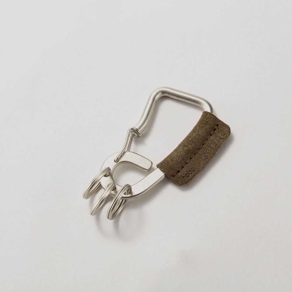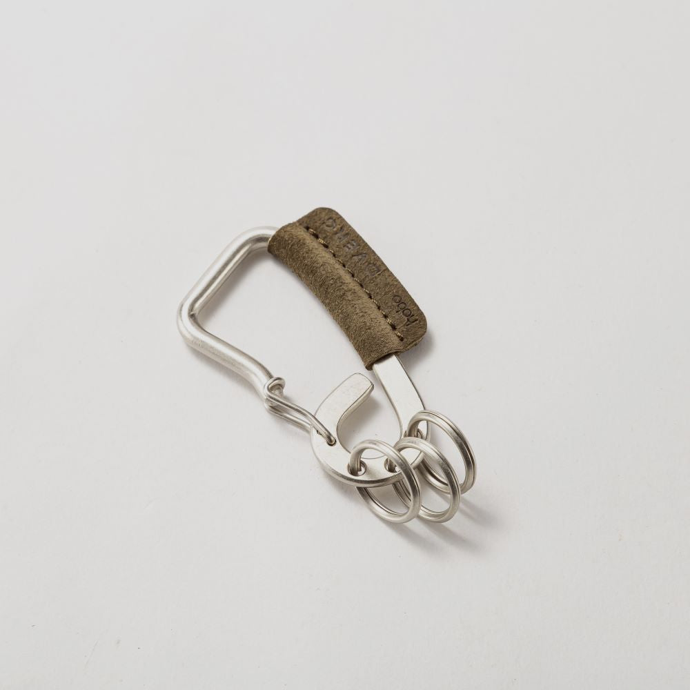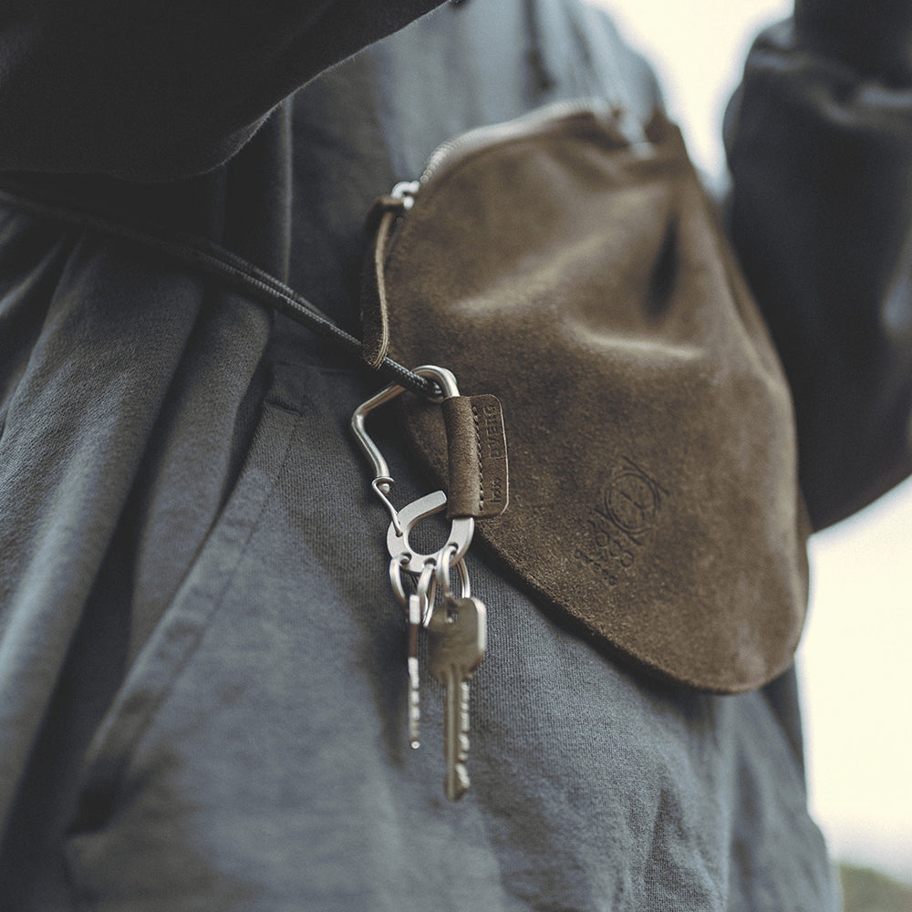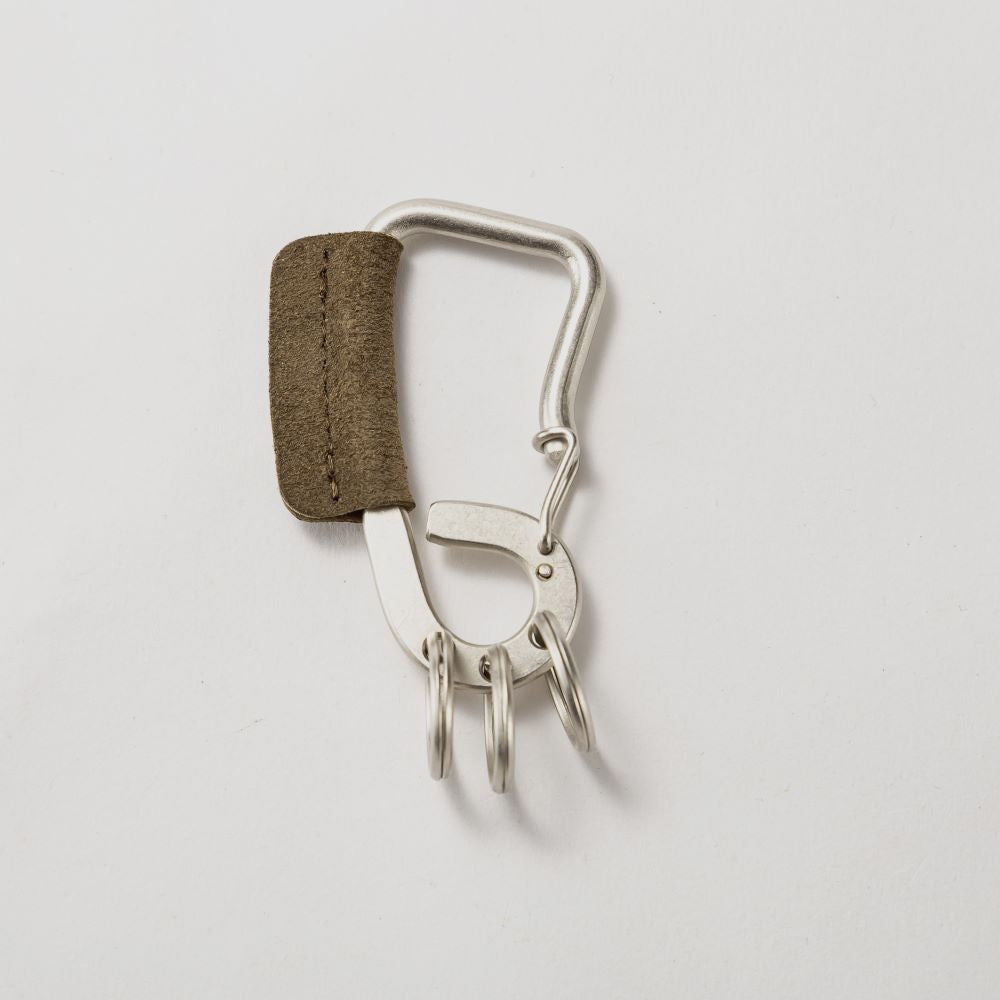 独自のフォルムにスウェードがアクセントとなり使い込む毎に風合いが生まれるカラビナ。