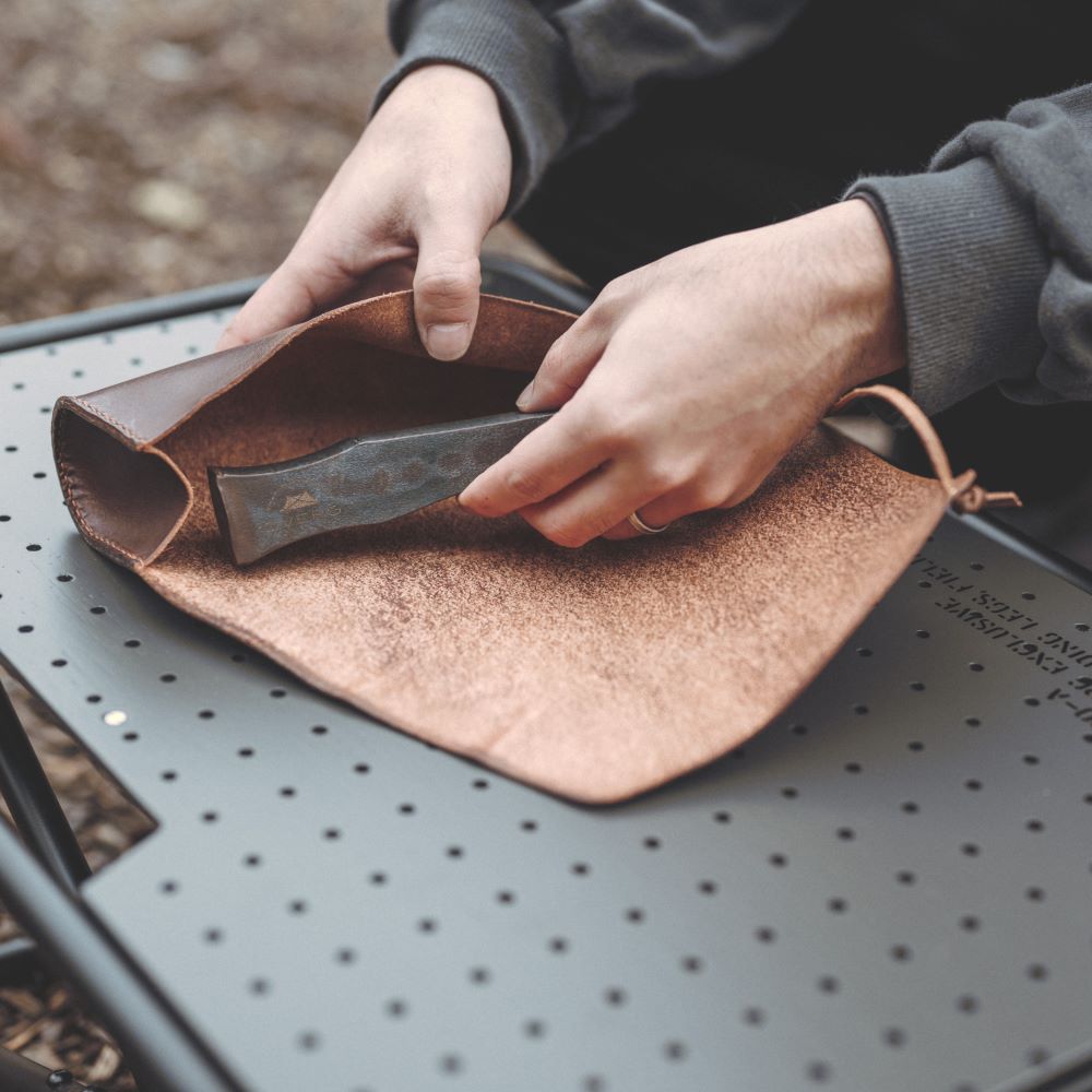 通常、革の床面処理には「トコノール」が使われますが、本製品は自然由来で環境に優しい「蜜蝋」で仕上げています。蜜蝋は高価ですが熱にも強いワックス。アウトドアでの使用を想定した、職人の気遣いが感じられる特別な仕様です。