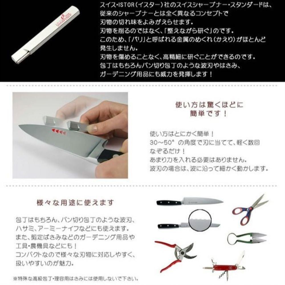イスター・スイスシャープナーは包丁だけでなく、パン切り包丁のような波刃やはさみ、アーミーナイフ、ガーデニング用品、工具、農機具にも使えます。