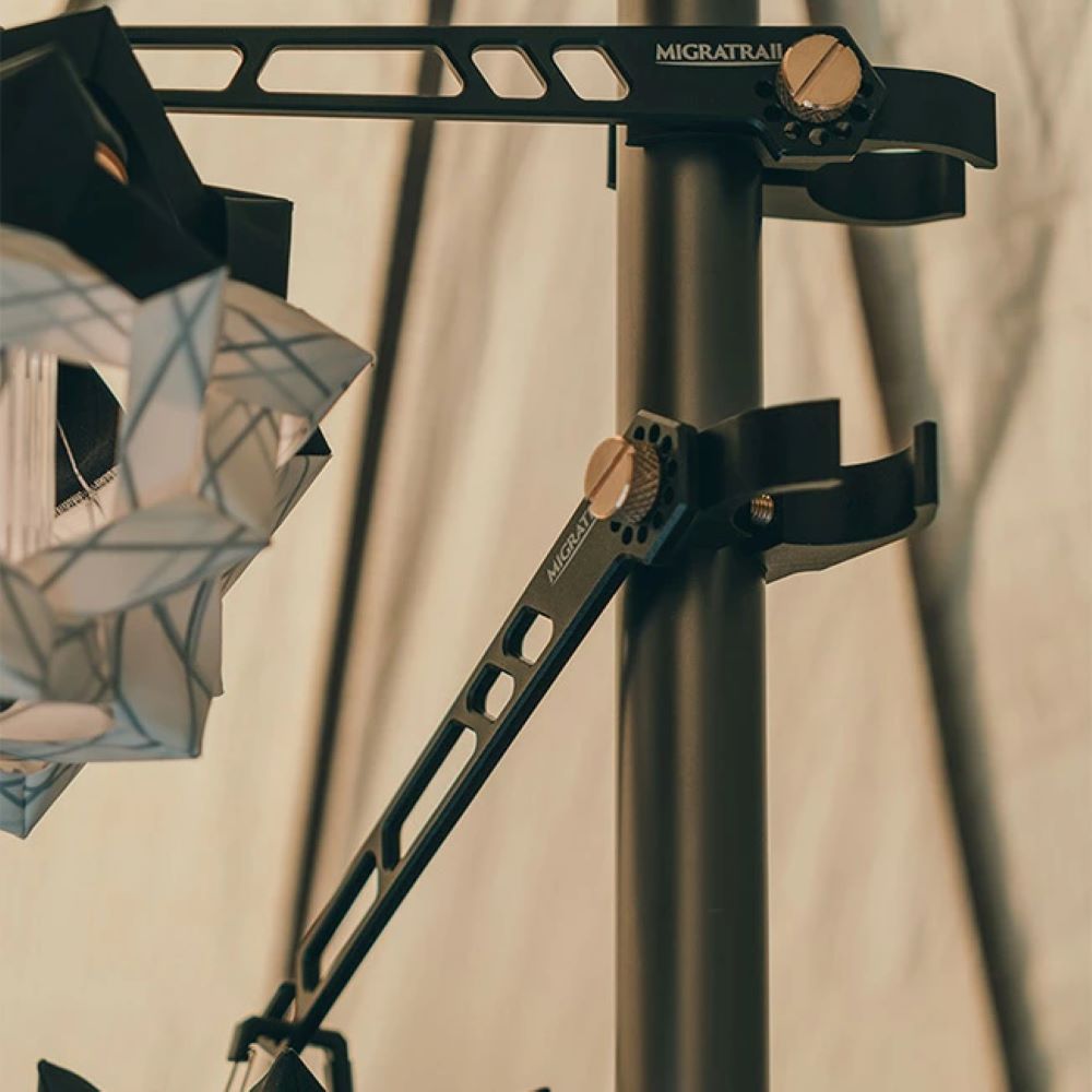 大径メインポールにクランプし、高い位置での使用を想定した存在感のあるデザインのマルチハンガー。