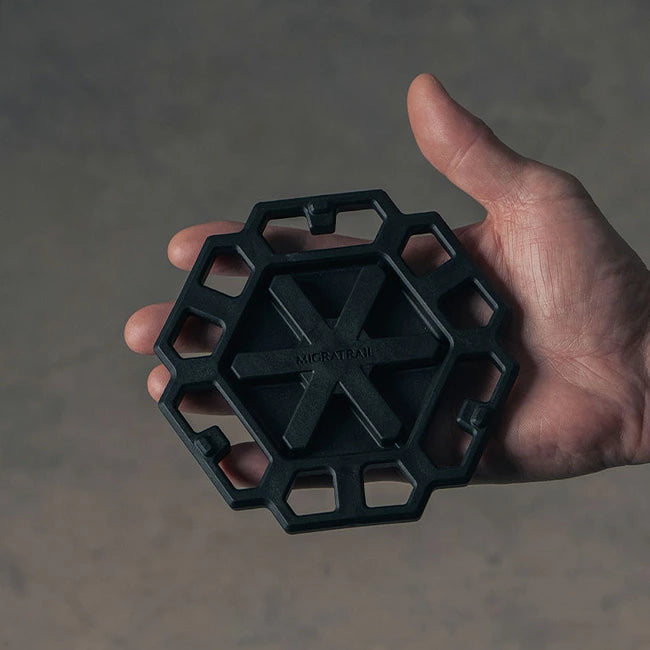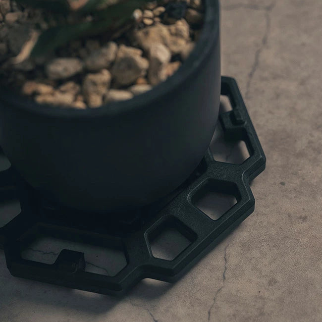 耐衝撃性、耐熱性に優れ、キャンプではコースター、リビングではポットマット、小型の観葉植物の水受け台として使用できる。