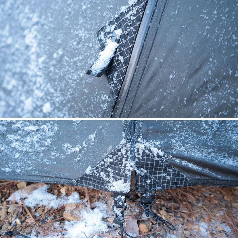 生地に負担がかかりやすいペグダウンポイント、ガイロープ接続部、ポール接触部はダイニーマで補強。