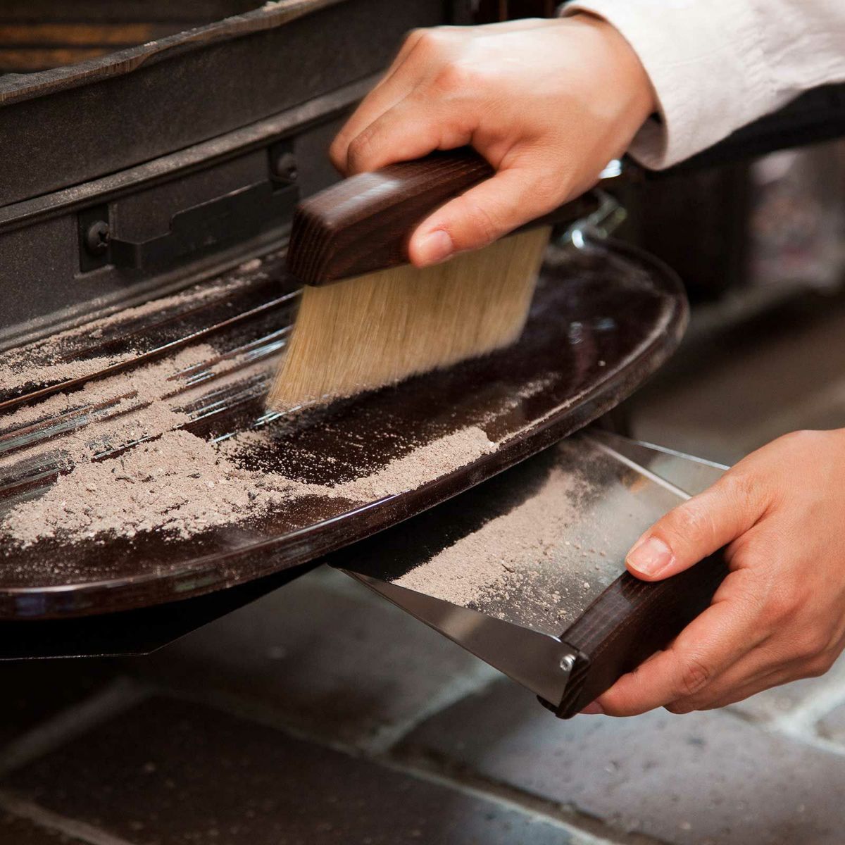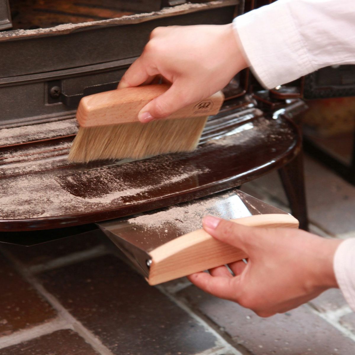 材料是彈性適中的猪鬃,緊緊貼合在柴爐的小台階上,長長的猪鬃可以讓你乾淨地收集細小的灰燼和木屑。