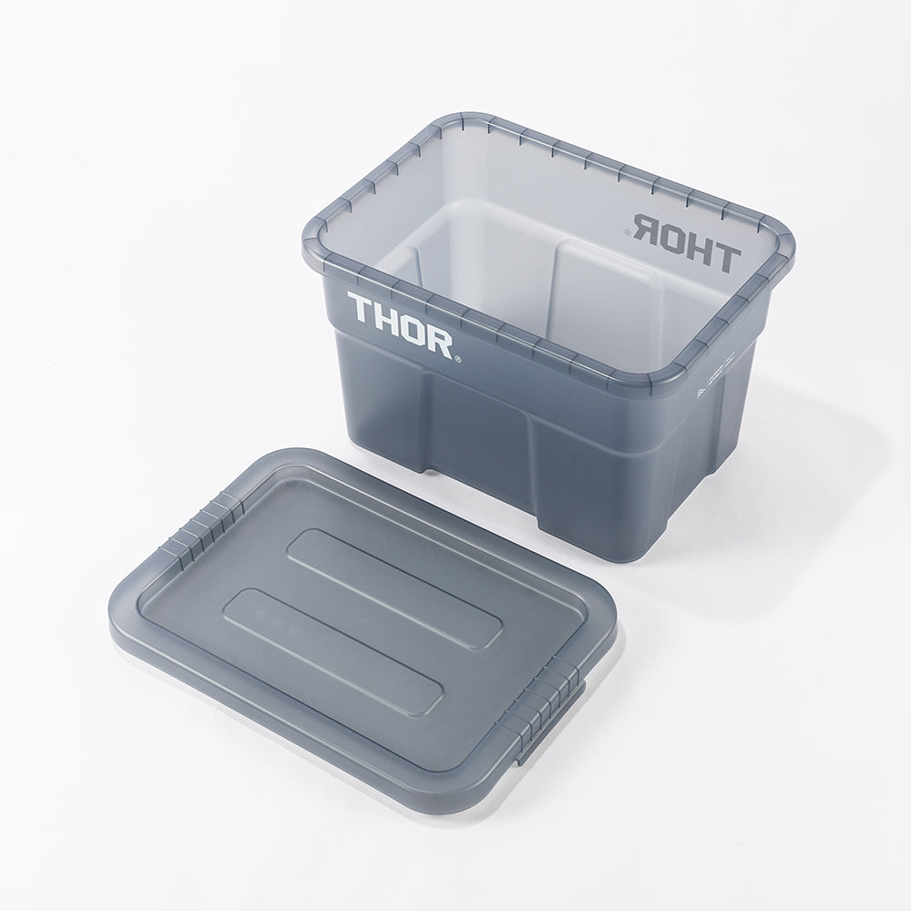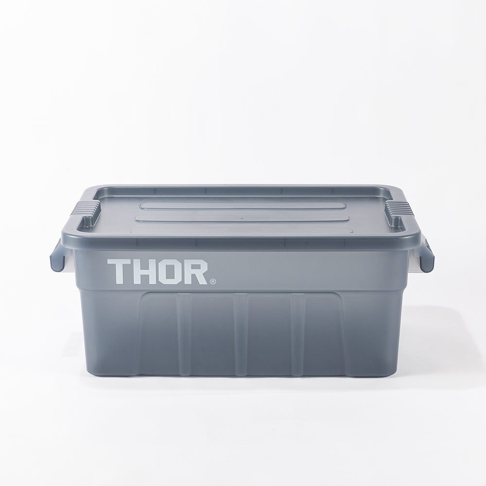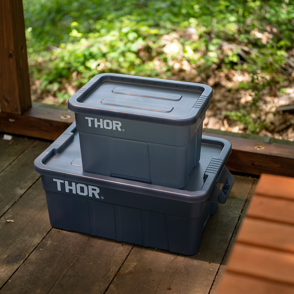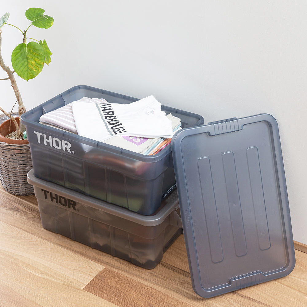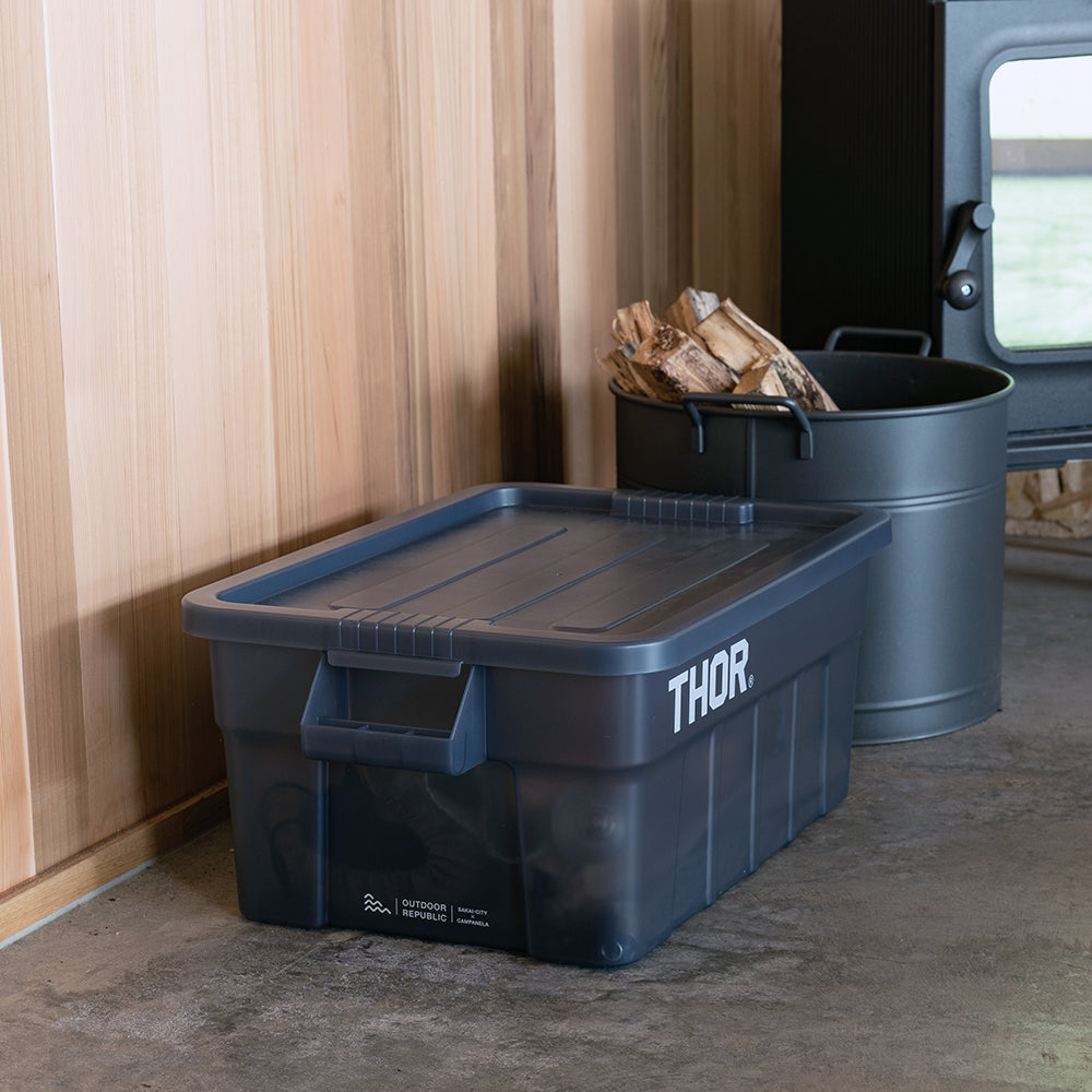 業務用メーカー「TRUST/トラスト」社の高い耐性を誇る屋内野外で使用可能なハンドル付きトートボックス/コンテナ「Thor Large Totes With Lid /ソーラージトートウィズリッド」の23L、53LサイズをSUNDAY MOUNTAINが優しい雰囲気のブルーグレーをクリアにして、よりライトなイメージに、オリジナルカラーで別注。