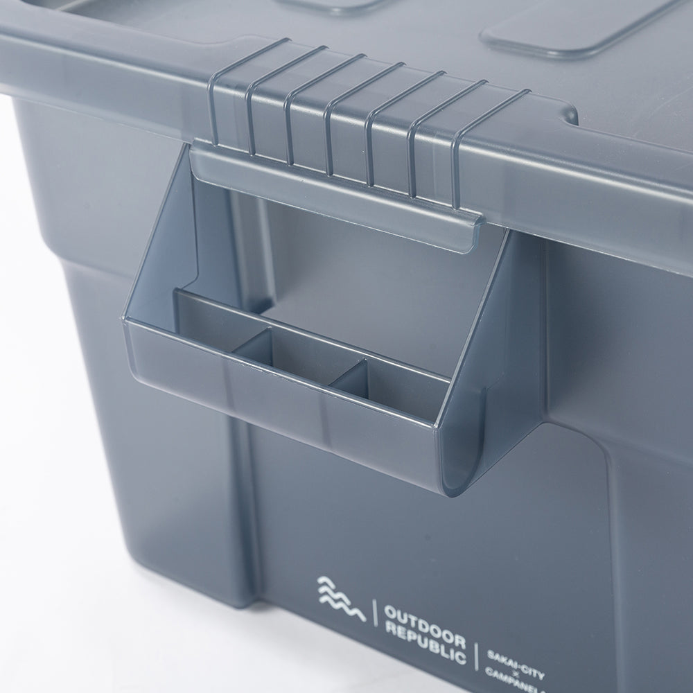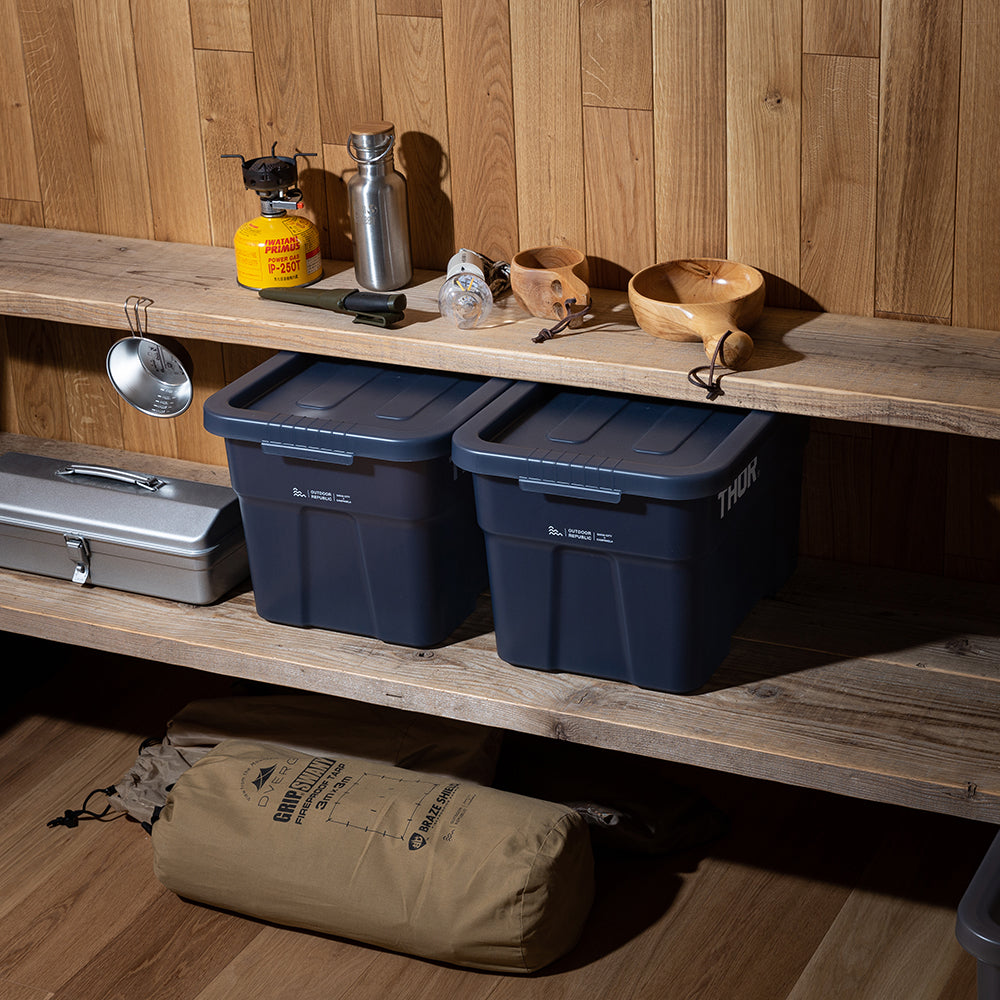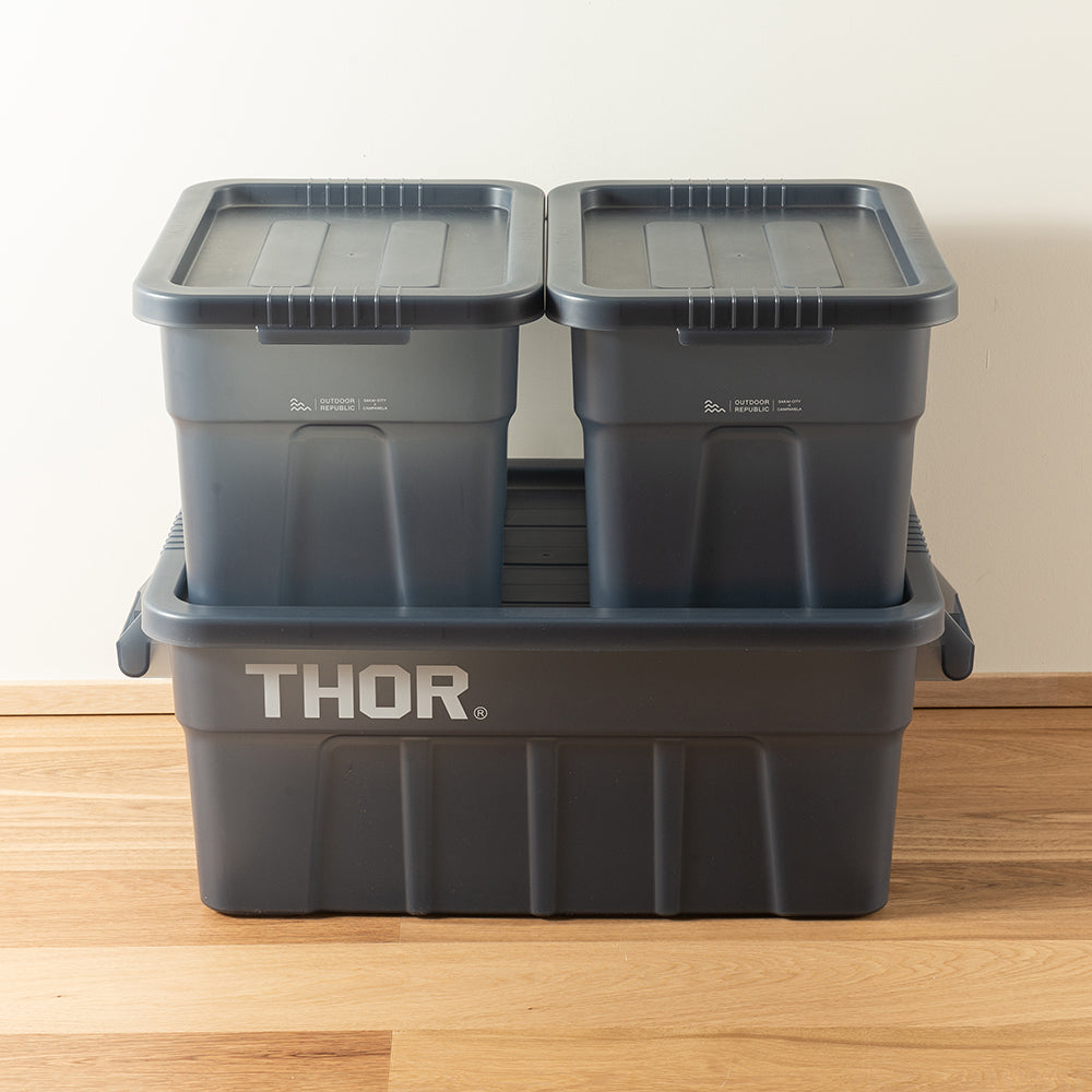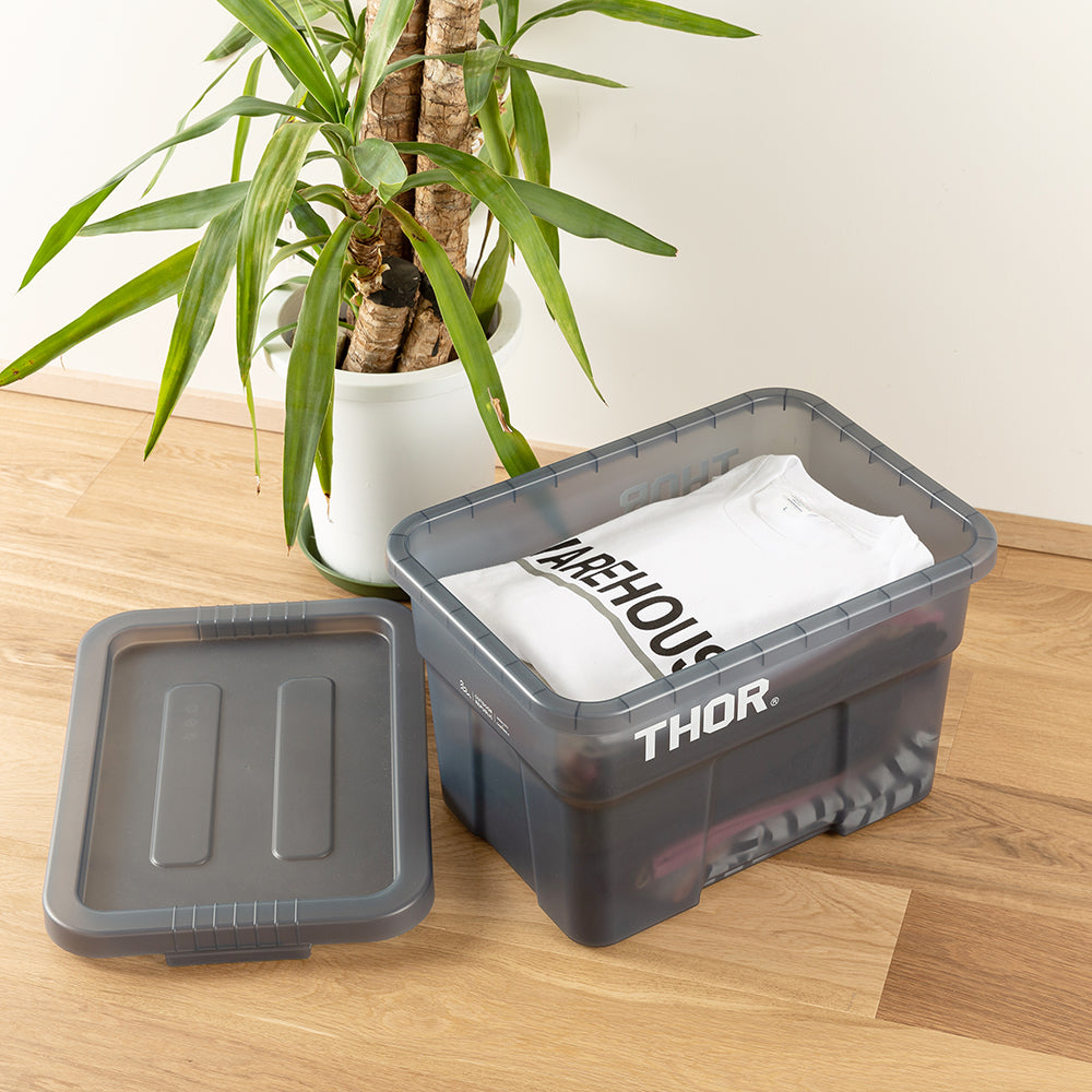 業務用メーカー「TRUST/トラスト」社の高い耐性を誇る屋内野外で使用可能なハンドル付きトートボックス/コンテナ「Thor Large Totes With Lid /ソーラージトートウィズリッド」の23L、53LサイズをSUNDAY MOUNTAINが優しい雰囲気のブルーグレーをクリアにして、よりライトなイメージに、オリジナルカラーで別注。
