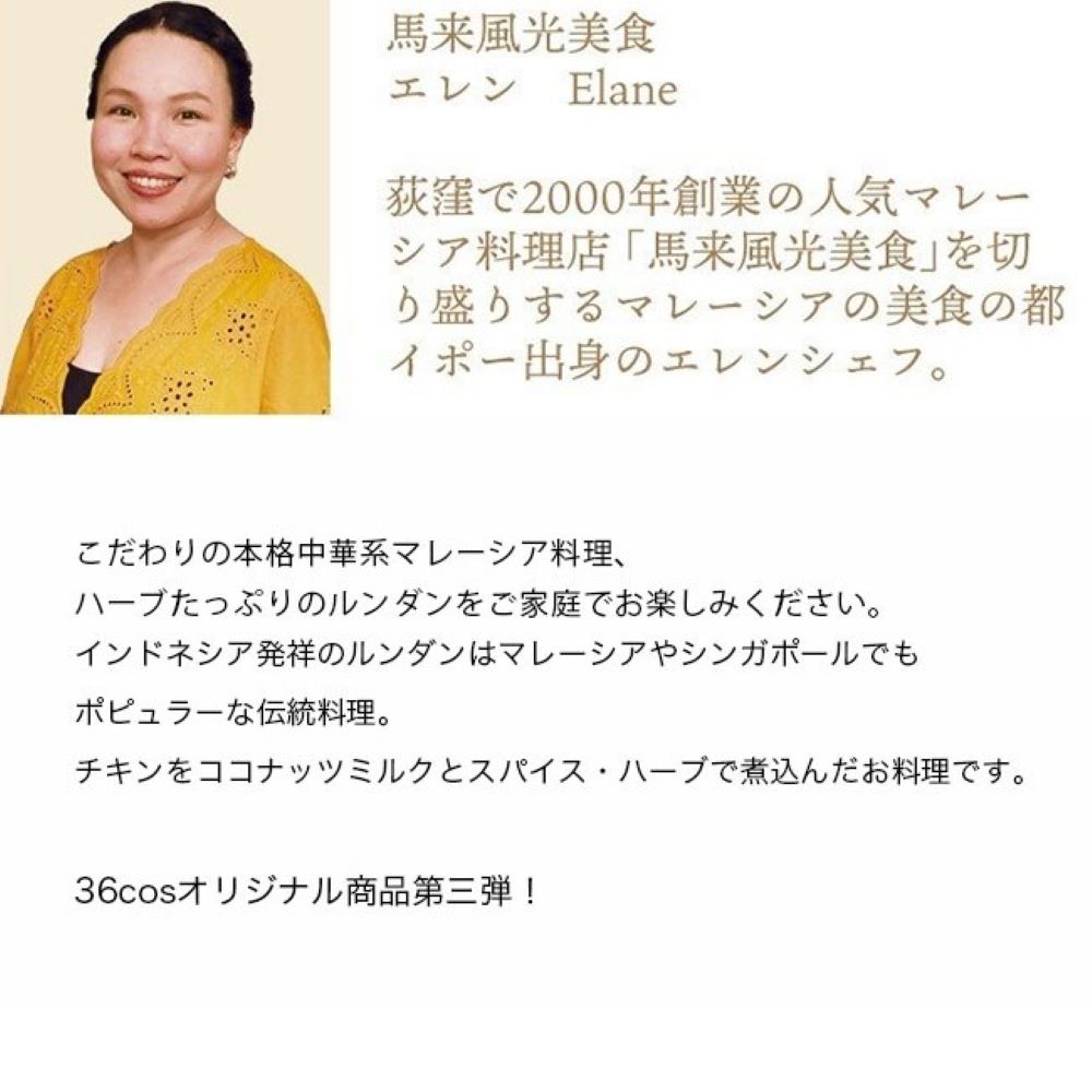 | 材料 | 鶏肉(手羽もと)、玉ねぎ、食用調合油、ココナッツミルクパウダー、ココナッツロング、レモングラス、おろししょうが、ガランガー、おろしにんにく、スターアニス、ココナッツオイル、タマリンド、食塩、カイエンペッパー、ターメリック、カルダモン、砂糖、シナモン、カフィアライム(一部に乳成分・鶏肉を含む) |