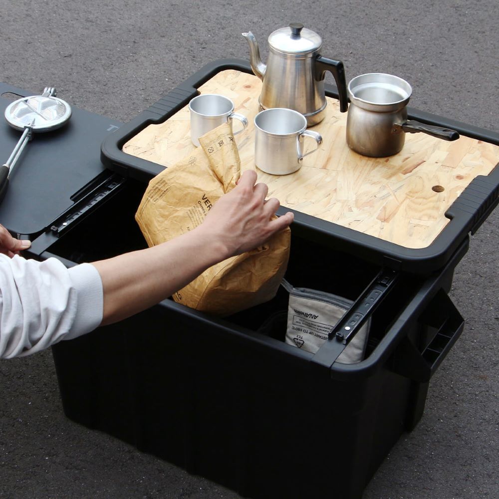 屋内、野外で使用可能なハンドル付きコンテナボックス75L。