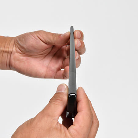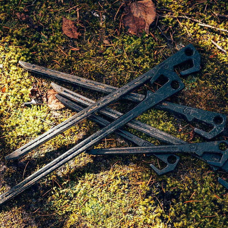 フラットなデザインなので、重ねて束やすく、ペグ打ち作業時に複数本を手に持ちやすくなっています。また、凹凸が少ないので汚れも落としやすく、道具入れをクリーンに保てます。
