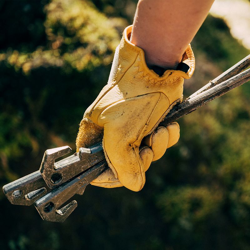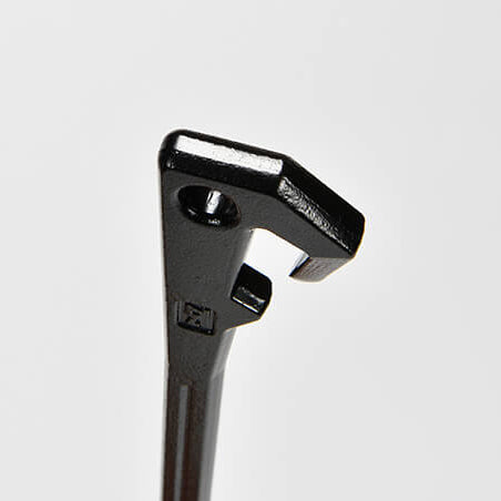 ペグ打ち作業時に誤って引っ掛け部先端が手に当たらないよう、安全ガードがついています。ガードは、ロープの掛け外しがし易いよう、打ち込み深さを抑制する役割も果たしています。