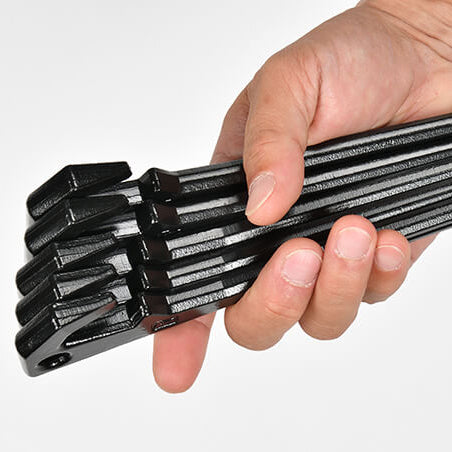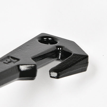 フック部は片面だけ斜めに大きく削ぎ落として、ロープを掛けやすくしています。また、掛けたロープの滑りを良くするため、ロープが当たるコーナーのみ、Rを大きく取っています。