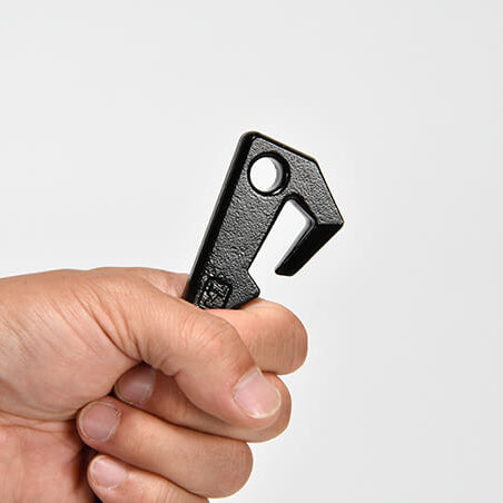 ヘッド部分は、ロープが外れないフックの長さと引き抜き用の穴サイズを確保しながら、コンパクトにデザインし、打ち込んだ際のヘッドの飛び出しを最小にしています。