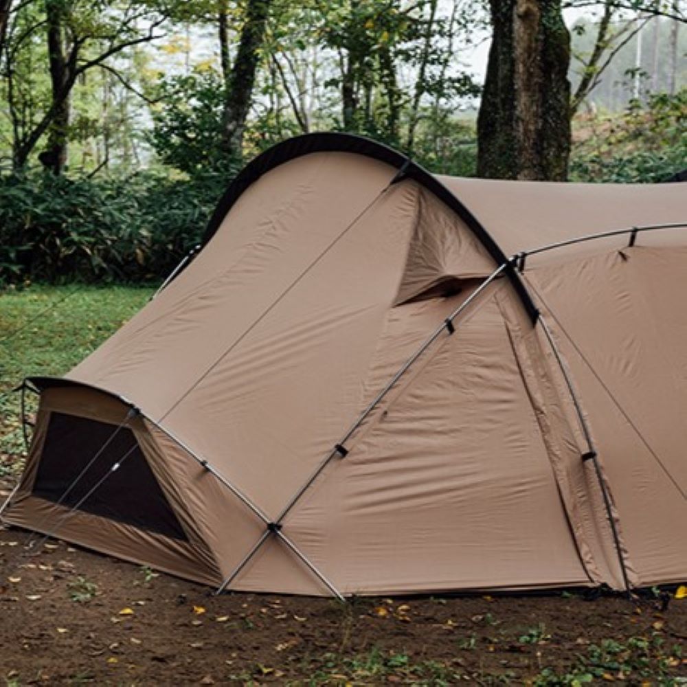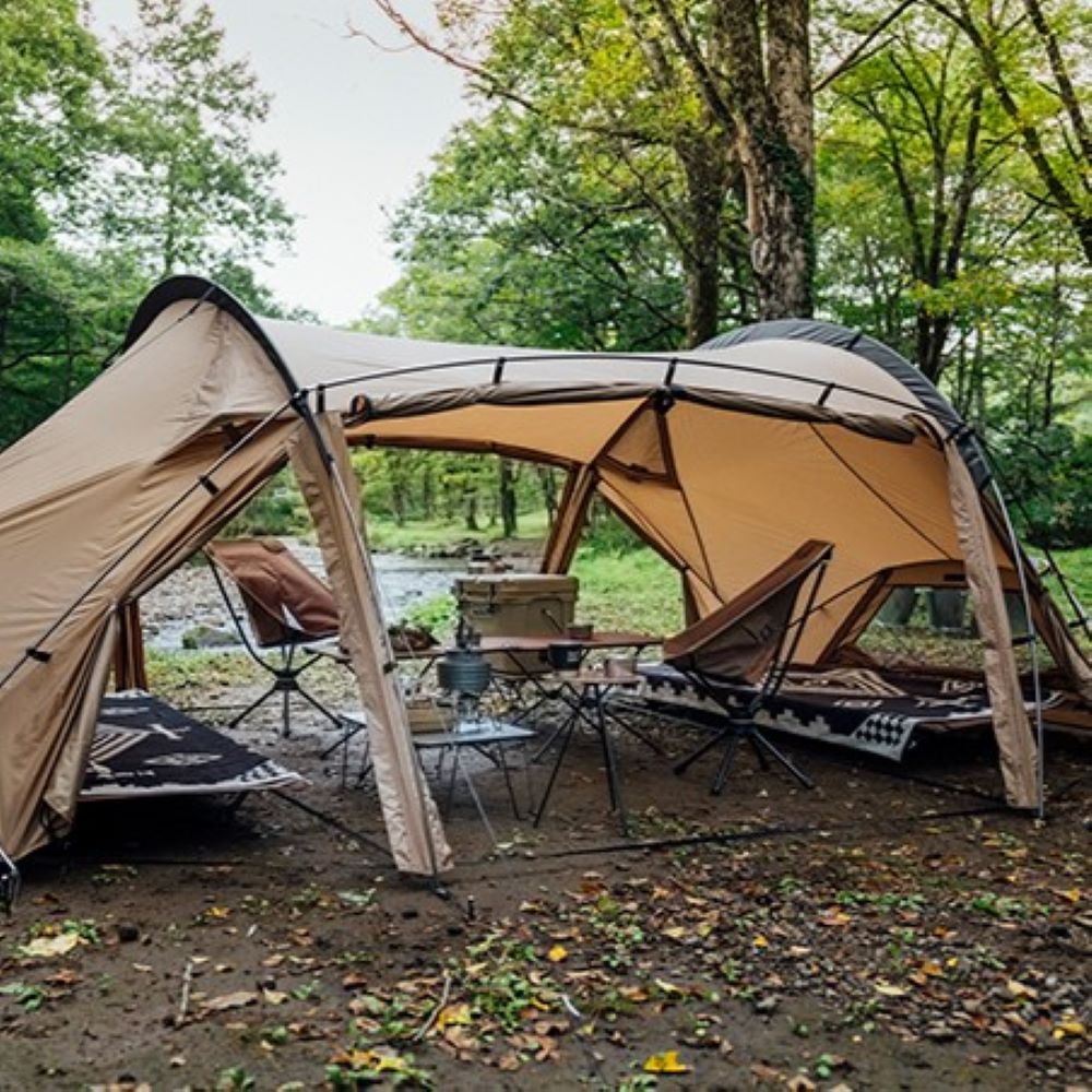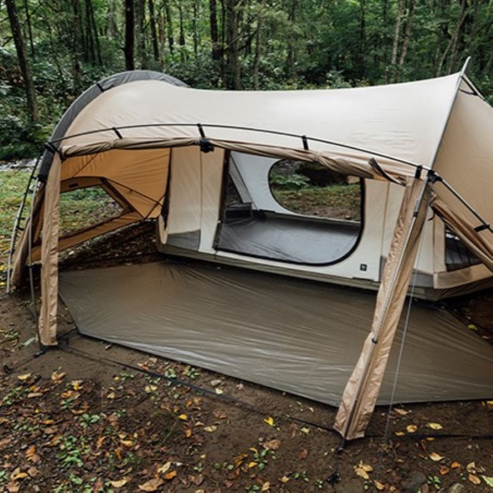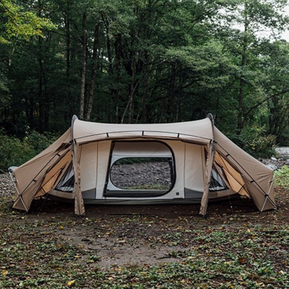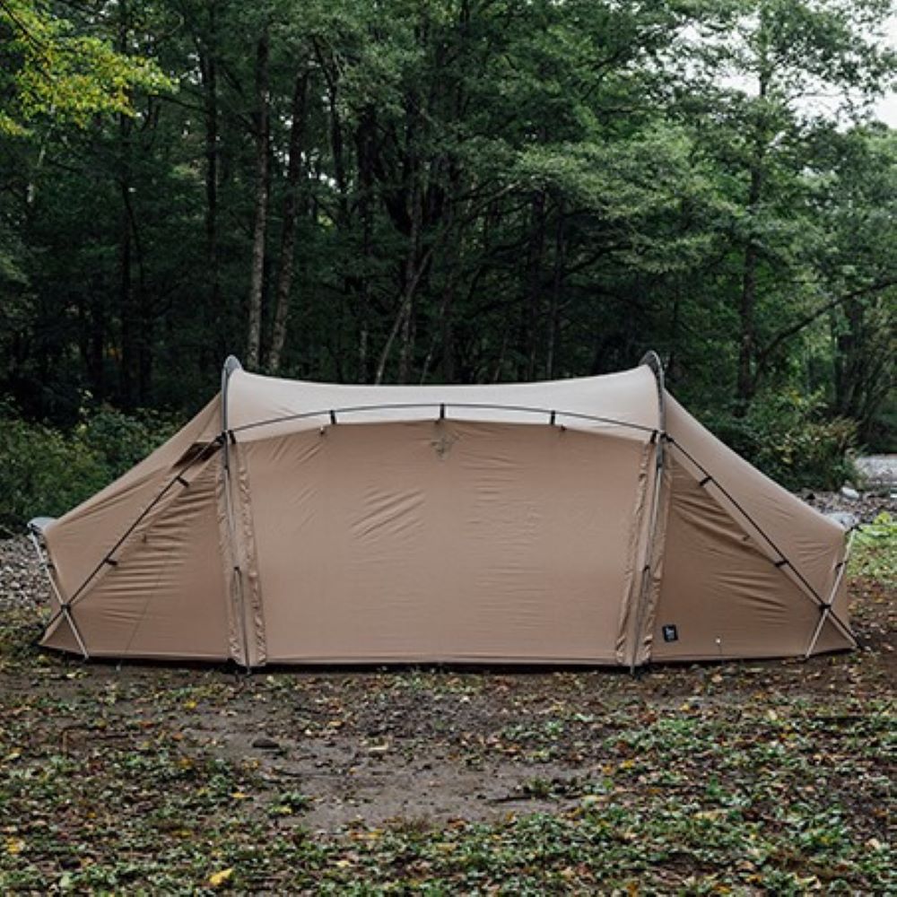 アウトフレーム構造により、インナーテントを外せばシェルターとして使用ができます。二人用のファニチャー・キッチン・コットを入れてフルクローズできるキャパシティー。リビングに利用可能なシート