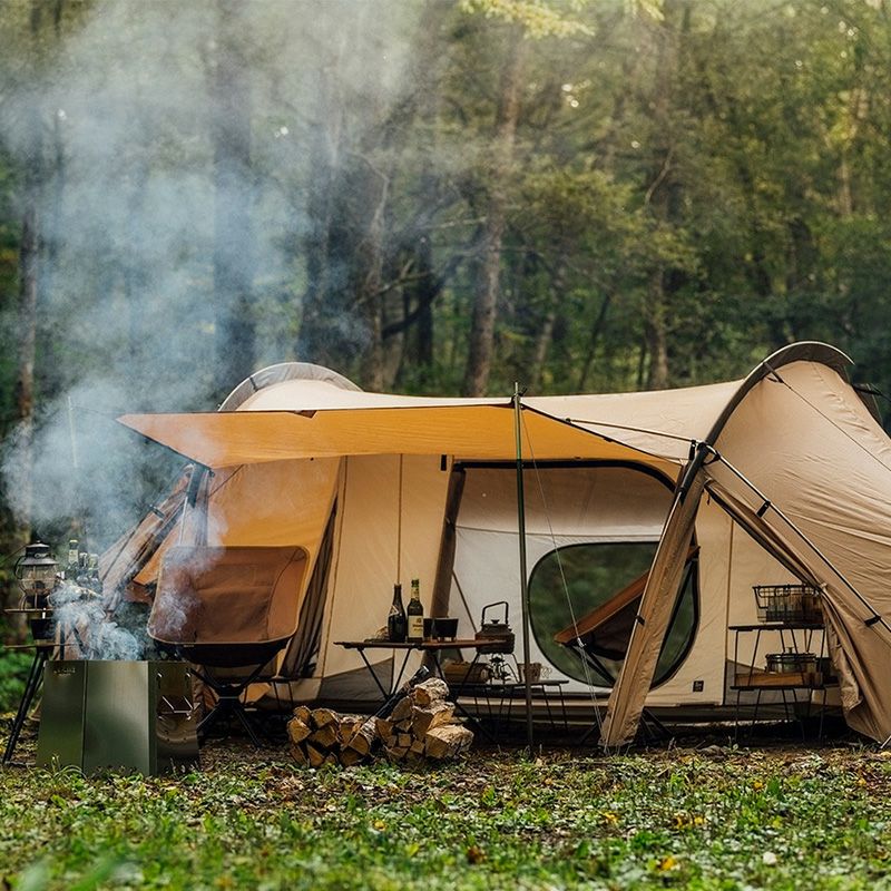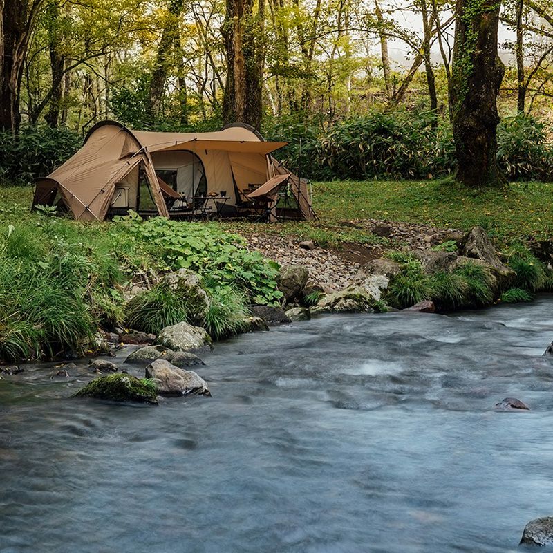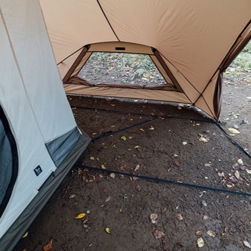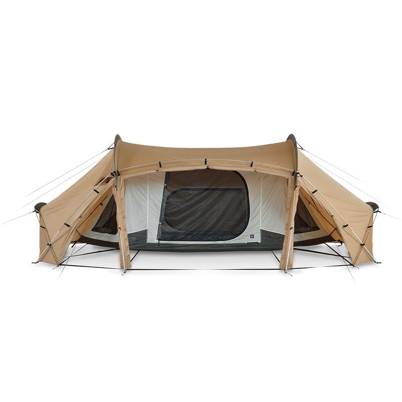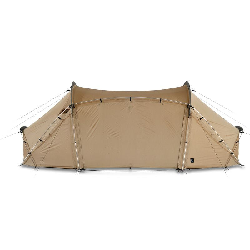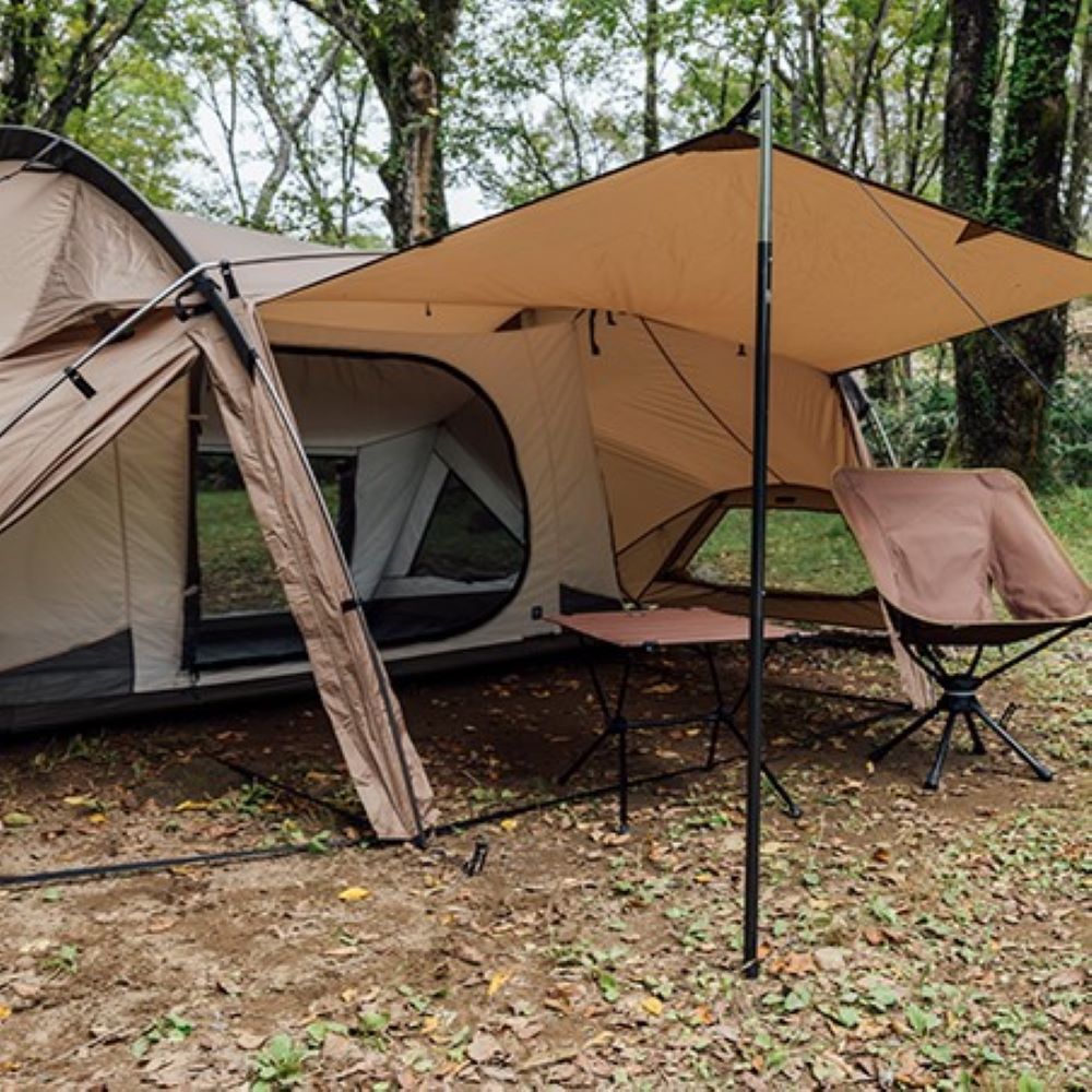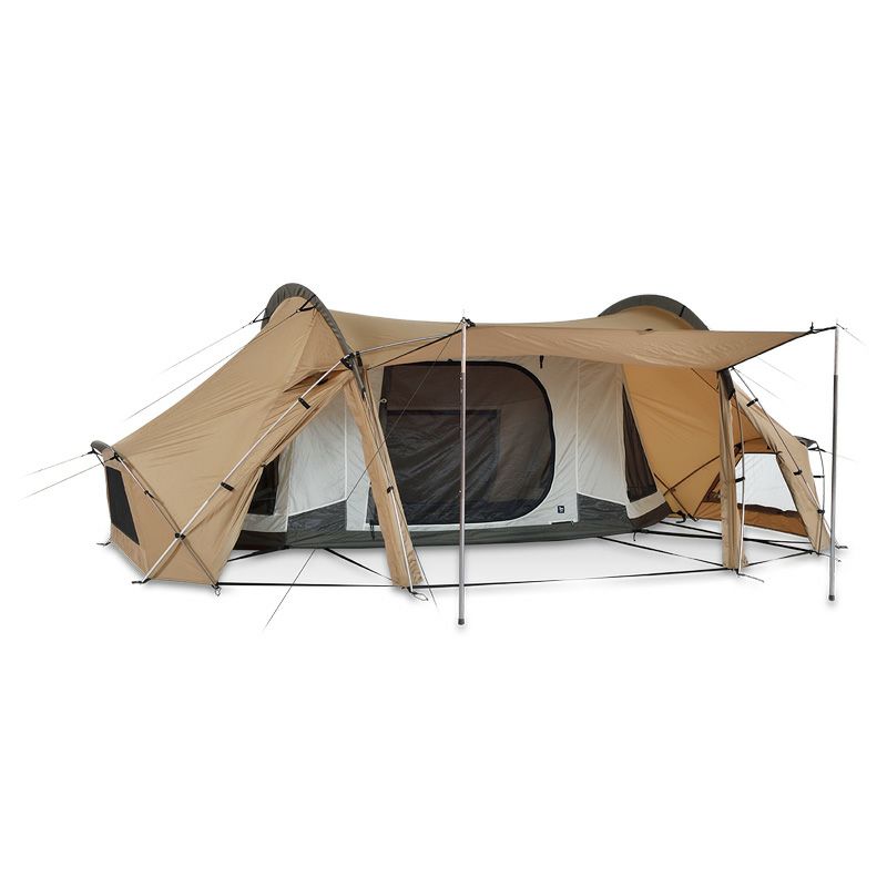 アウトフレーム構造により、インナーテントを外せばシェルターとして使用ができます。二人用のファニチャー・キッチン・コットを入れてフルクローズできるキャパシティー。リビングに利用可能なシート